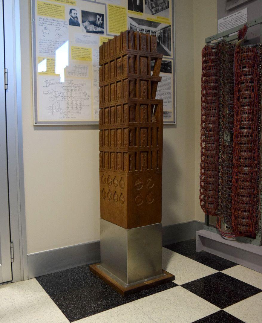 "‘MainFrame’ was the centrepiece of an exhibition by Leigh Christensen at the Oedipus Rex Gallery in 1994. The exhibition comprised a number of pieces inspired by the computers and their history. We have two other works from the exhibition on display, the ‘Difference Engine’ on floor 2 and ‘Bessie and the Bug’ on floor 5.”