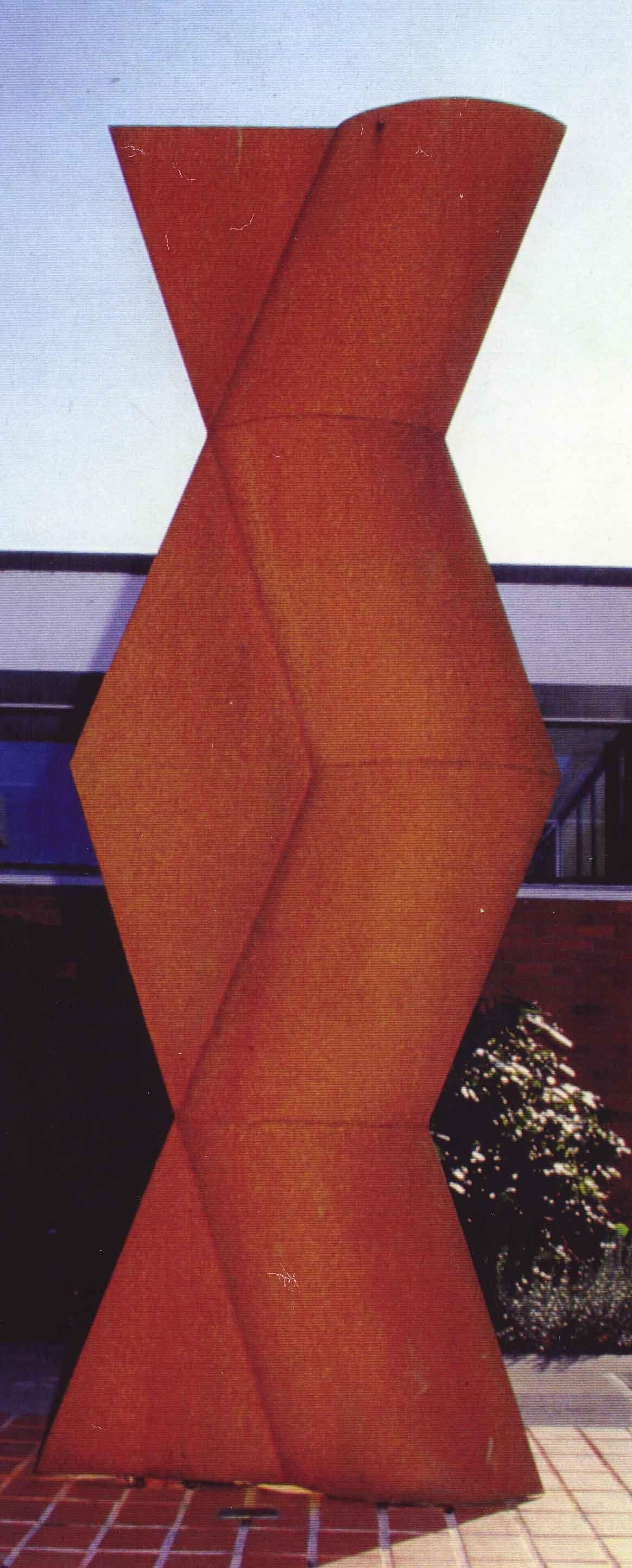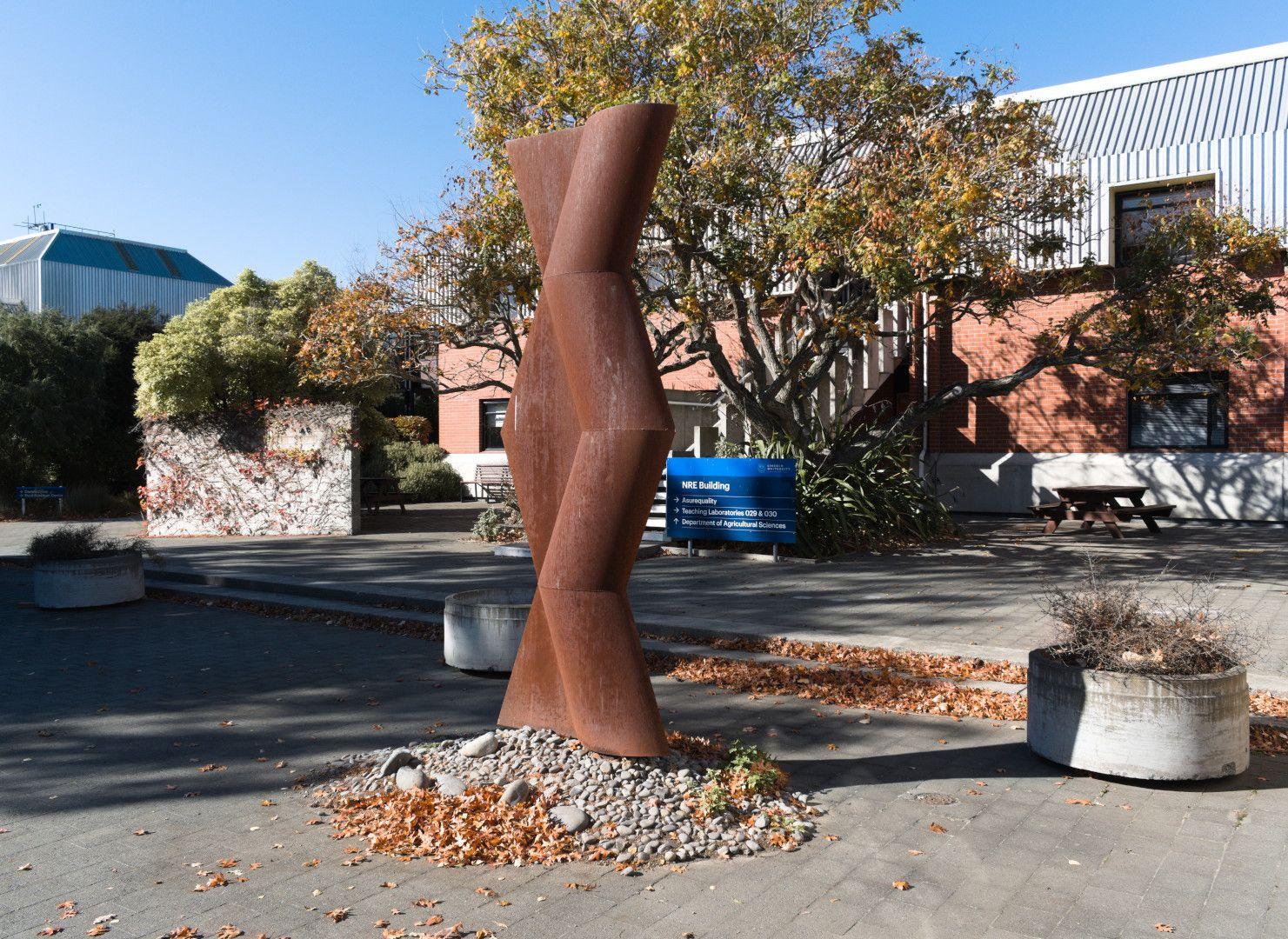 "Symbolising growth and the endless opportunities in the agricultural sector, this sculpture was created by Malcolm Doidge not long after graduating from the University of Canterbury School of Fine Arts. Representative of a Greek column, the artist was interested in creating a work that could have a sense of mass or of no mass depending on your viewing angle. It was funded through a Department of Labour scheme in 1984.
