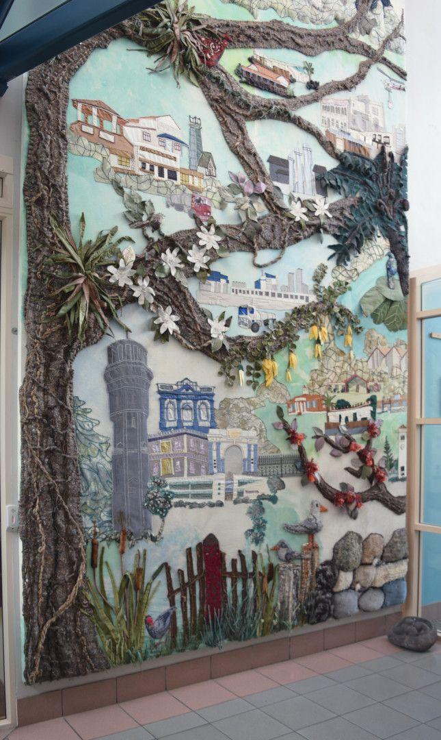 The work depicts all the smaller councils that went into creating the larger South Taranaki District. Work on the piece was was organised by embroiderer, Shirley Julian, who approached Margarett Scott for the design. Scott completed a watercolour cartoon which was cut into small squares for 30 members of the South Taranaki Stitchcraft Guild and the Stratford and Opunake Embroiderers’ Guild to work up.