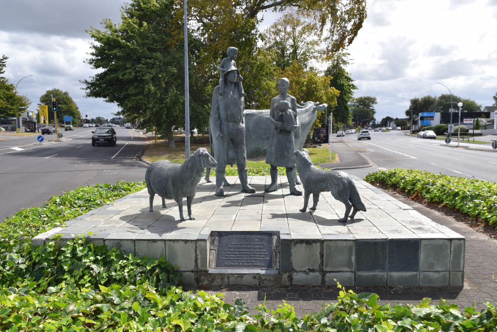 Located on the corner of Ulster and Victoria Streets (southern end), the life-size figures of this cast bronze sculpture include a male farmer and his wife, their two children, a cow, a sheep and a dog. This work commemorates the ordinary farming family as being iconic in the Waikato region.