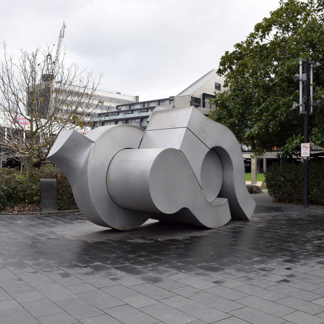 A twisting sculpture, fabricated in M10 aluminium, that is representative of Newmarket's industrial past.