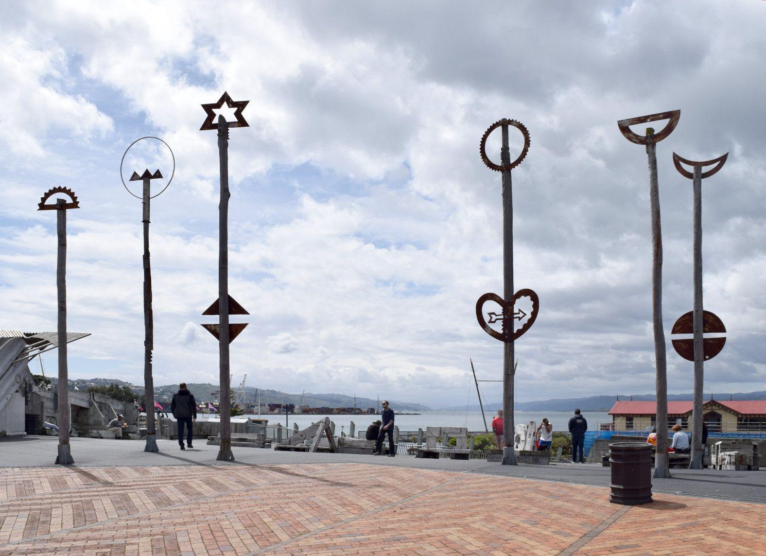A large, complex work integrating wood sculptures of taniwha (Ngake and Whātaitai) or whales, birds and fish, with poles carrying symbols of stars and the moon in various phases ('celestial pou'), on a functional bridge crossing the multi-lane Jervois Quay.