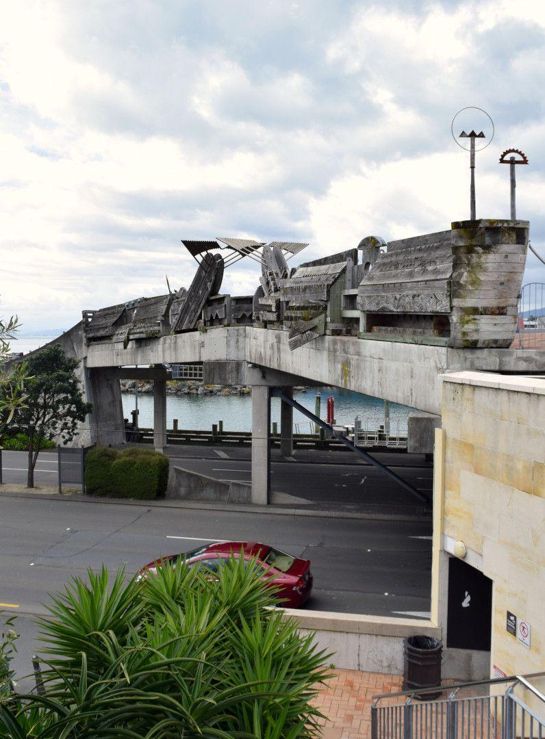 Matchitt's pieces for the bridge were made at a farm in the Esk Valley from locally felled exotic coniferous trees. All parts were trucked to Wellington, arriving in the middle of the night to be ritually washed in the sea before being craned into place. Gray recalls being amazed at how easily everything seemed to fit together.