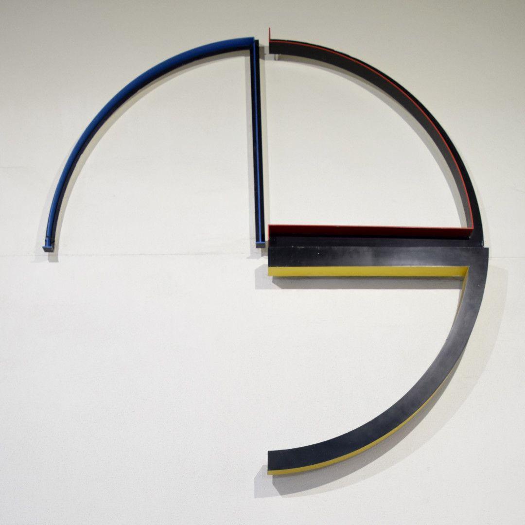 “The sculpture is a play on a single geometric form, a quarter circle with an attached radius, three parts of the circle are included, with the fourth left for viewers to complete, giving them the opportunity to participate in the work. The work used to have a second part, an even more minimalist tracing of the forms in the slates on the floor, but unfortunately this was later tiled over.”