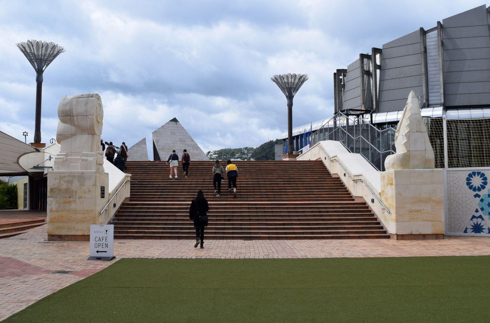 “Capital and Prow / The sculptures by Matt Pine on either side of the stairs are part of aseries of 10 works called Reflections on an Ancient Past. / Capital (above) is based on European classical architectural elements with koru form on the edges. / Prow (on the other side) depicts a Maori canoe prow with Taniko weave motif on the edges – a mix of European and Maori cultural elements.”