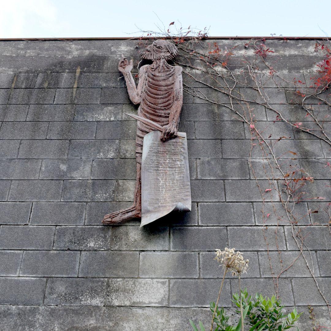 A corten (weathered) steel sculpture of St Paul looking gaunt and holding a scroll and feather pen. The words on the scroll provided by Father Duggan.
