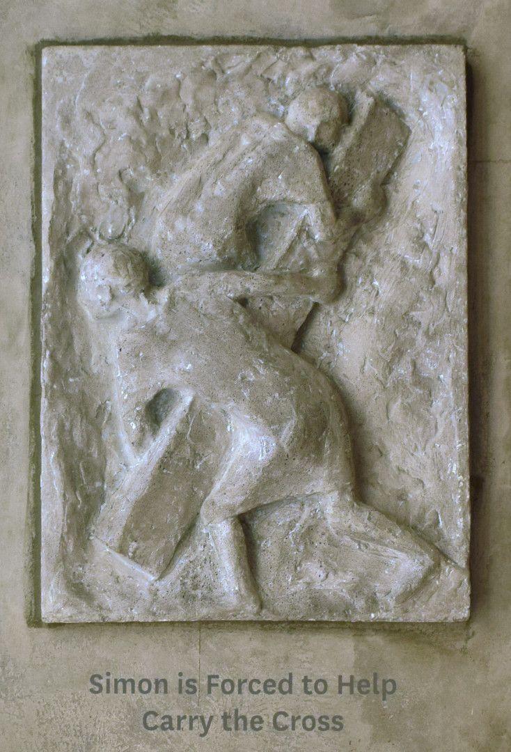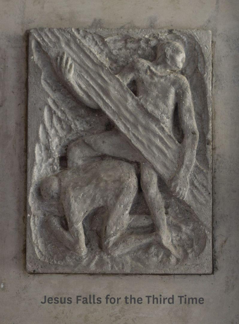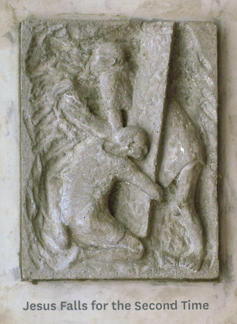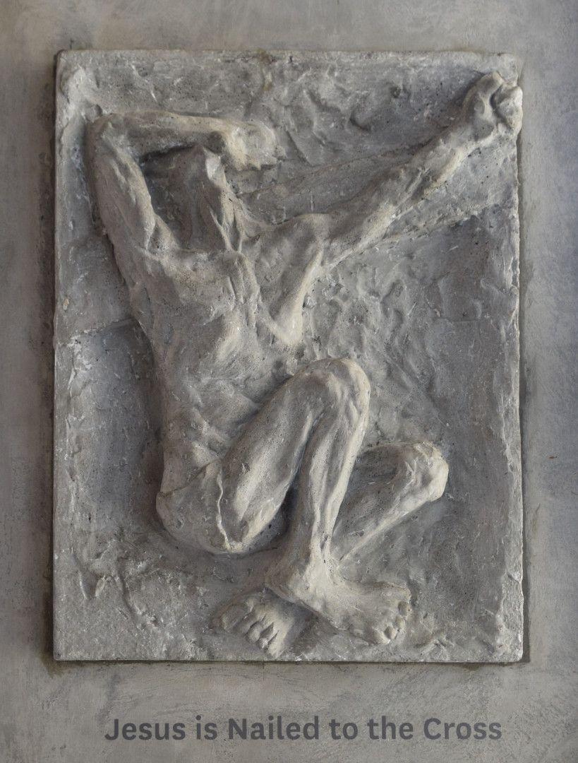 “Commissioned 1968 for stations to be produced in ciment fondu. This medium [was] chosen to fit the architectural detailing of the church but also has appropriately prosaic connotations for telling the story of the Passion and Crucifixion in the no-nonsense way that Smither had in mind. The choice of such an unsympathetic medium added weight to his concentration on the portrayal of the pain of the journey to the cross.