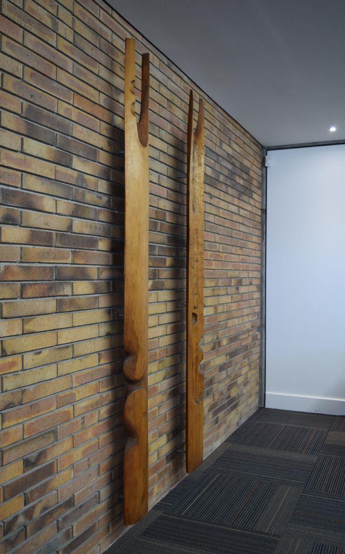 Carved in tōtara Muru Walters described the shape on the left as a male form, and the right a more female/inner form. The pou are site-specific works, designed to fit with the architecture of the building. This is why, though pou, the works are fixed to the wall of the building "rather than as freestanding figures".[1]
