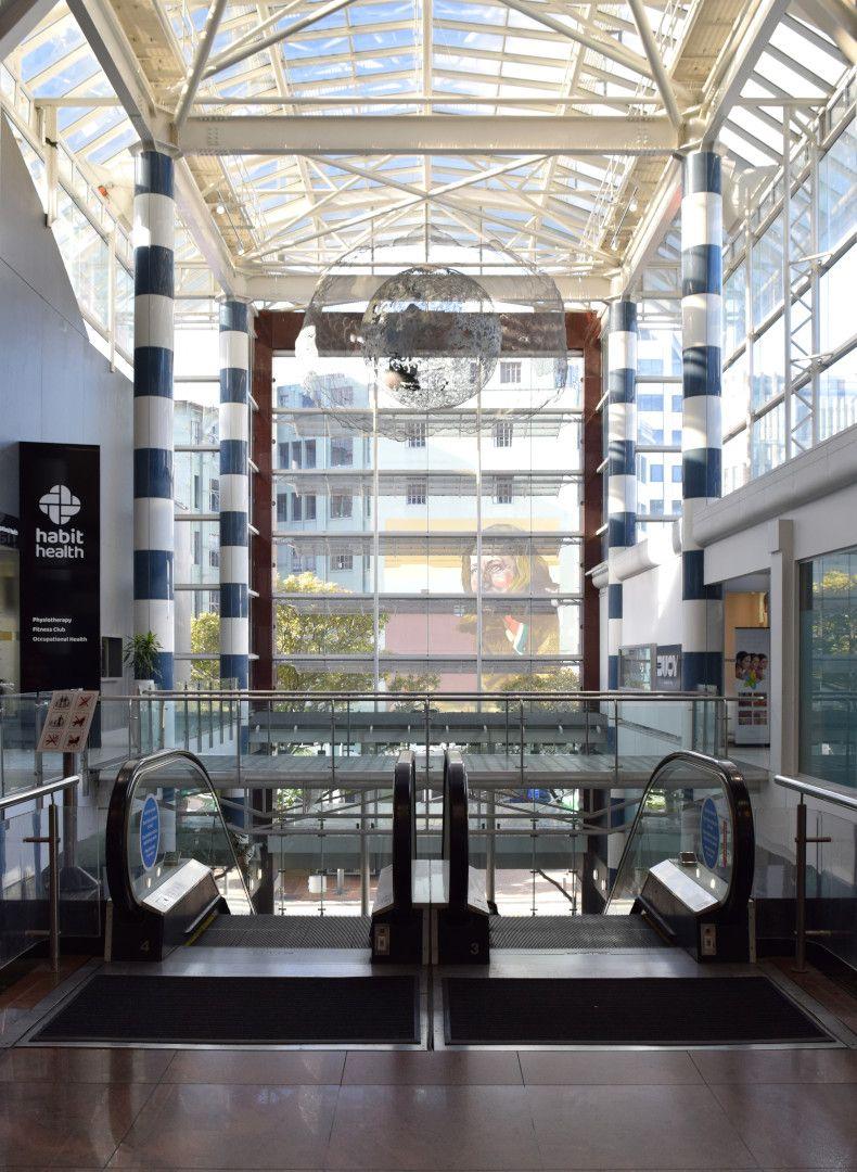 Suspended above the two-storeyed lobby is this floating orb. A delicate silvery envelope encircles a silver sphere: the earth with its cloud cover. NZ is there, but what has happened to Australia? It has giant rents, as if tectonic plates are pulling it apart. Higher up it appears the other continents are in tatters.