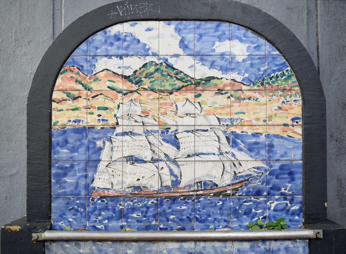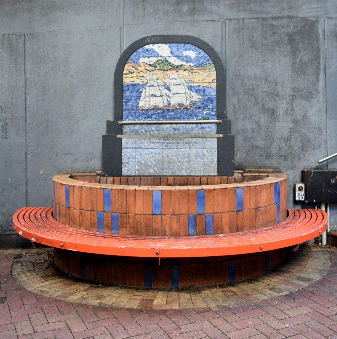 A memorial fountain with a ceramic mural painted by Nicola Mannering as a backdrop. It depicts the brig Gertrude that bought the Plimmer family to Wellington in 1841.