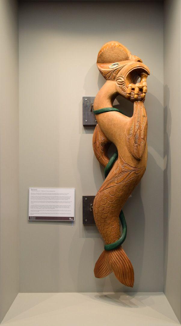 Waiwaiā is a tupuna (guardian being) of the waterways of the Waipā district and beyond. The carved representation of Waiwaiā is supported by beautifully handmade tukutuku (hand woven panel).