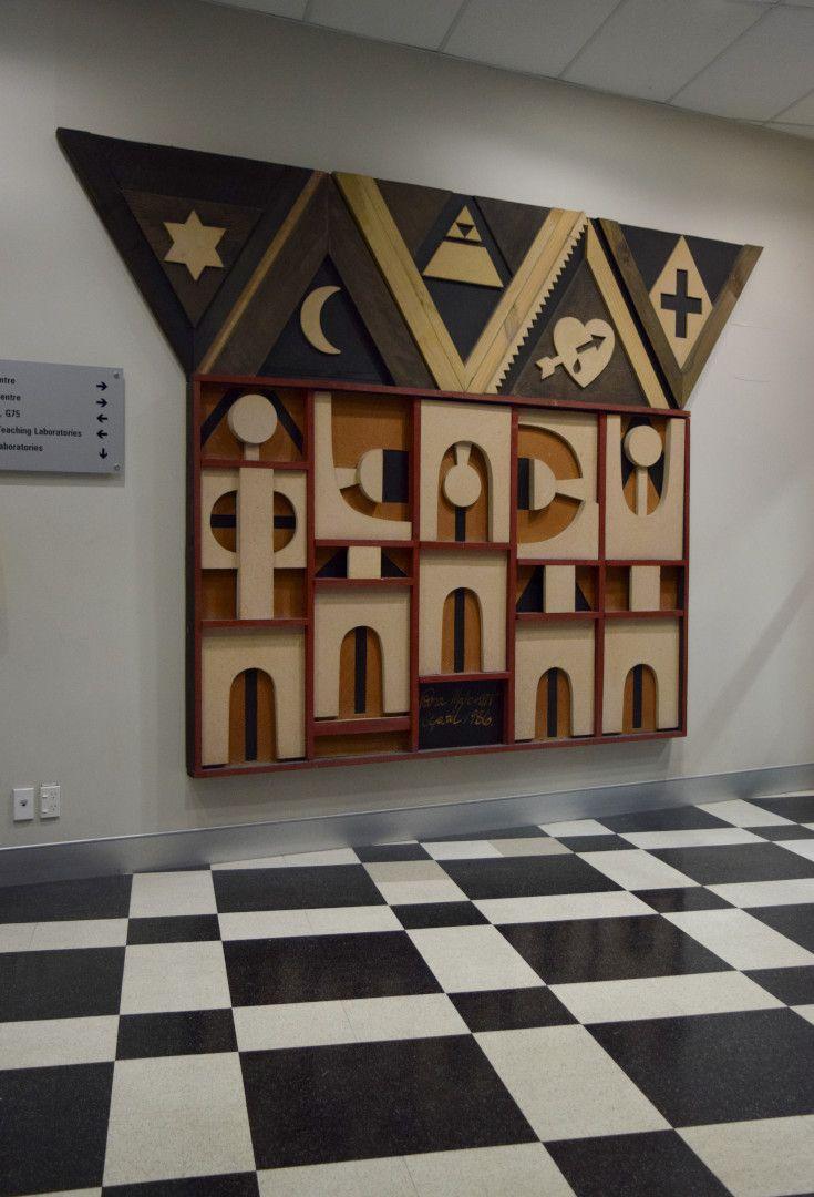 "Square, triangular and rectangular units in sections of wood and chipboard are nailed and butted together in this relief sculpture, forming an integrated collection of diverse components...