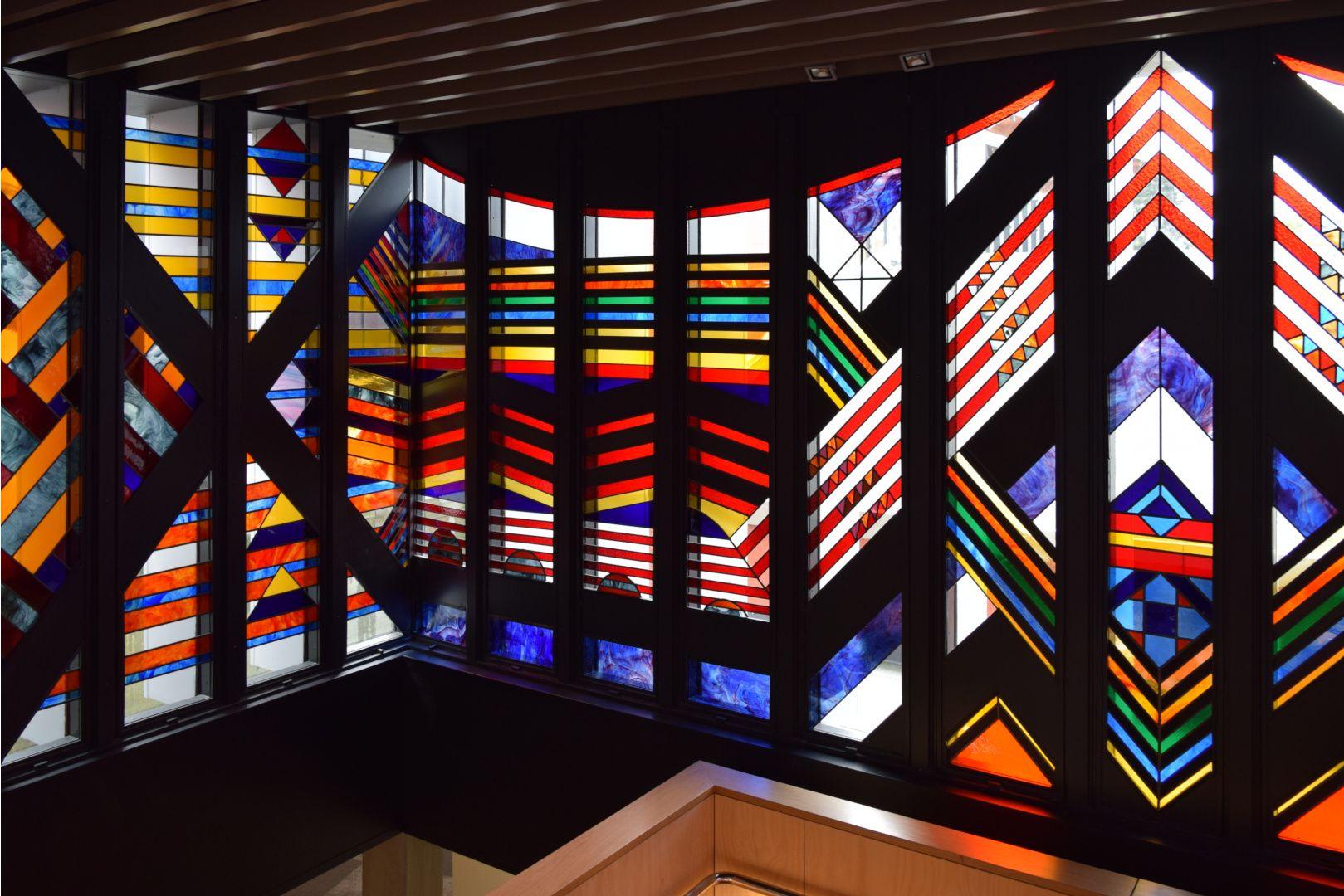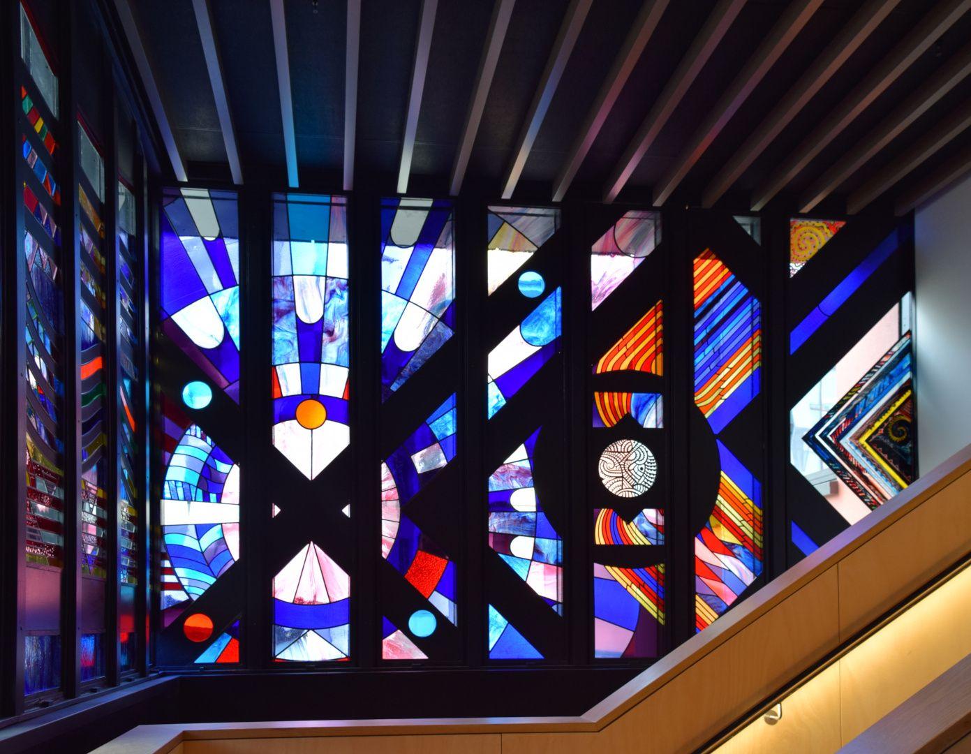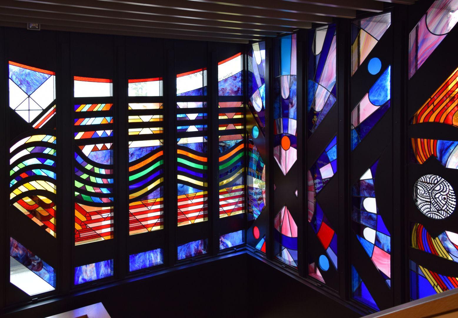 This strikingly vibrant painted and stained glass artwork stretches across three sides of a stairwell. The 27 panels are divided into three sections: The first section represents knowledge, depicted as 'Kete o te Wananga', the baskets of knowledge; the second section shows the nature of the ancient Waikato, the river forming a central motif with the whakatauki 'He piko, he taniwha' - on every bend of the river there is a power; and the third section represents elements of the cosmos, with the Southern Cross fixing the design in space and Halley's Comet fixing it in time.