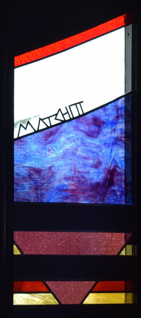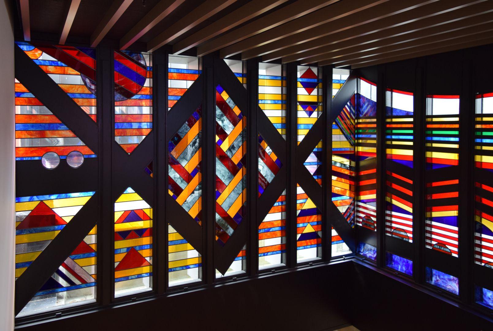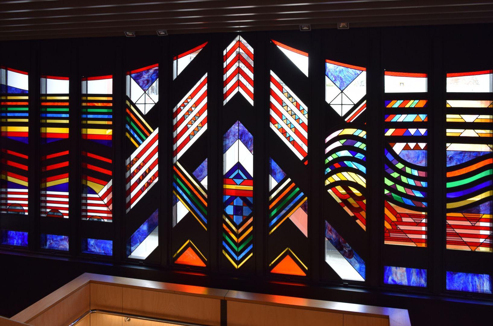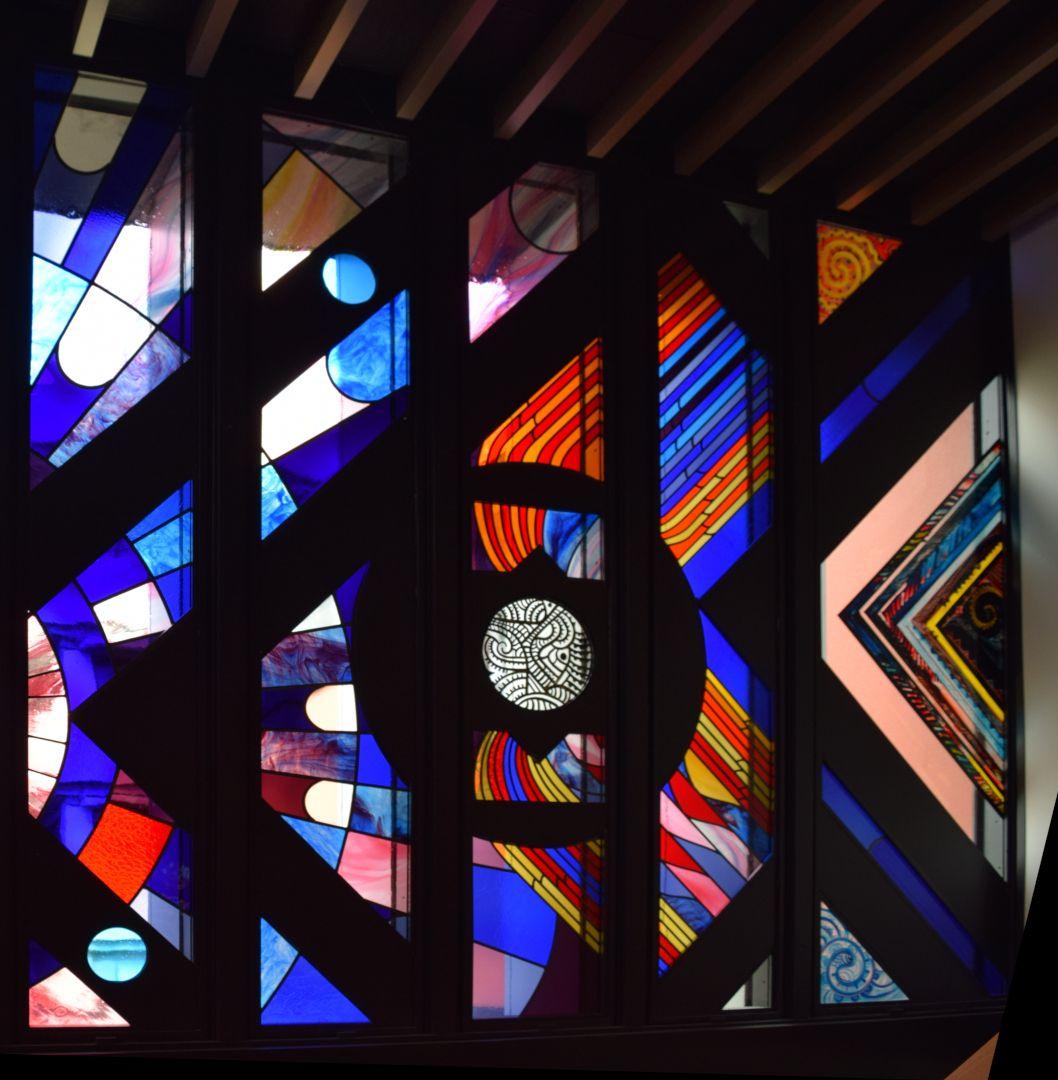 This strikingly vibrant painted and stained glass artwork stretches across three sides of a stairwell. The 27 panels are divided into three sections: The first section represents knowledge, depicted as 'Kete o te Wananga', the baskets of knowledge; the second section shows the nature of the ancient Waikato, the river forming a central motif with the whakatauki 'He piko, he taniwha' - on every bend of the river there is a power; and the third section represents elements of the cosmos, with the Southern Cross fixing the design in space and Halley's Comet fixing it in time.
