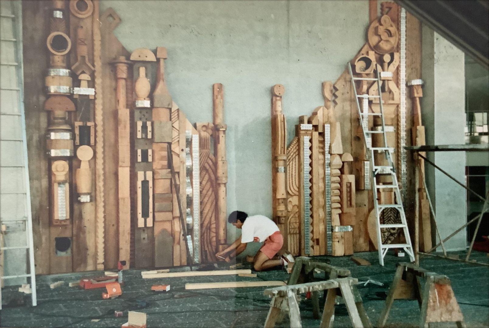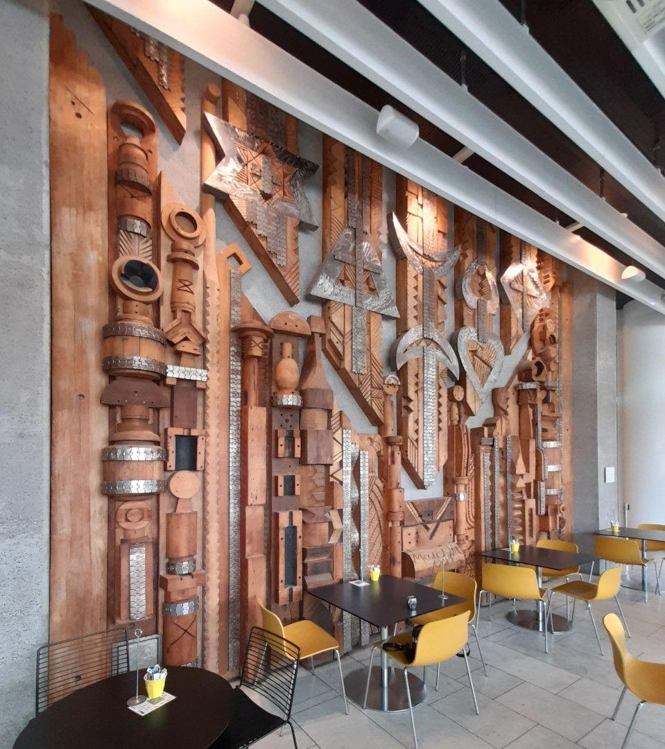 A very large sculptural relief, this work is constructed with local timbers, salvaged metal strips and an old conveyor belt. The height of the piece means that it cannot be viewed all at once. Matchitt suggested the work would be viewed in different ways by different people as they approached the work on various floor levels and from the interior and exterior.