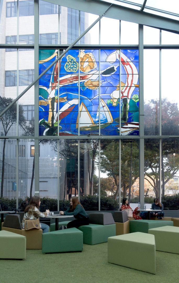 This work is a site-specific stained glass window made in commemoration of the Rainbow Warrior, which sank in 1985. The window produced by Glassworks Studio.