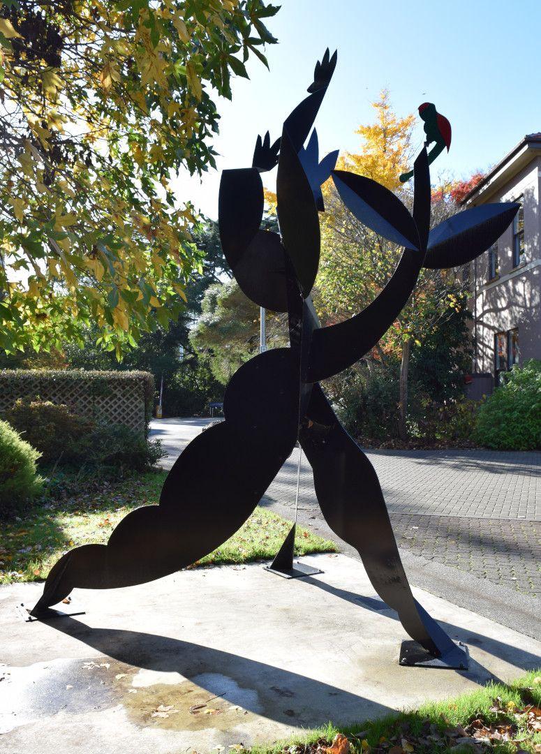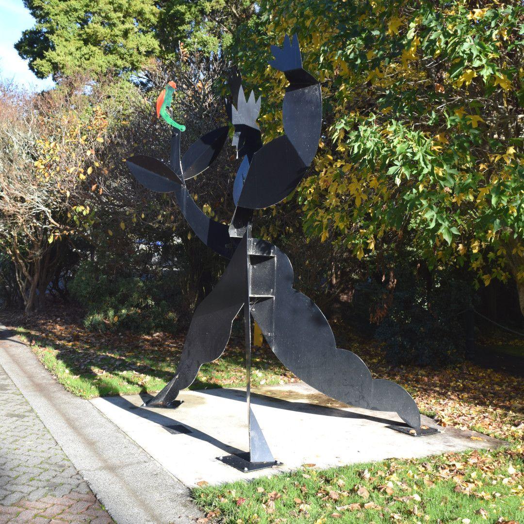 A tall human figure in cut and folded plate steel. Figure is painted black, wears a crown and holds up a green and red bird (parrot).