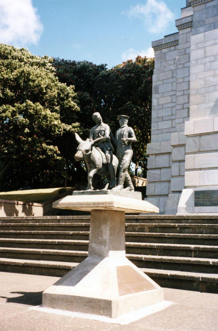 This bronze sculpture and incorporated plinth commemorates the 75th Anniversary of the Gallipoli landings on 25 April 1915, and is a tribute to the medical personnel, stretcher bearers, ambulance drivers, donkeys, and other animals who have served and died alongside New Zealand service personnel in war.