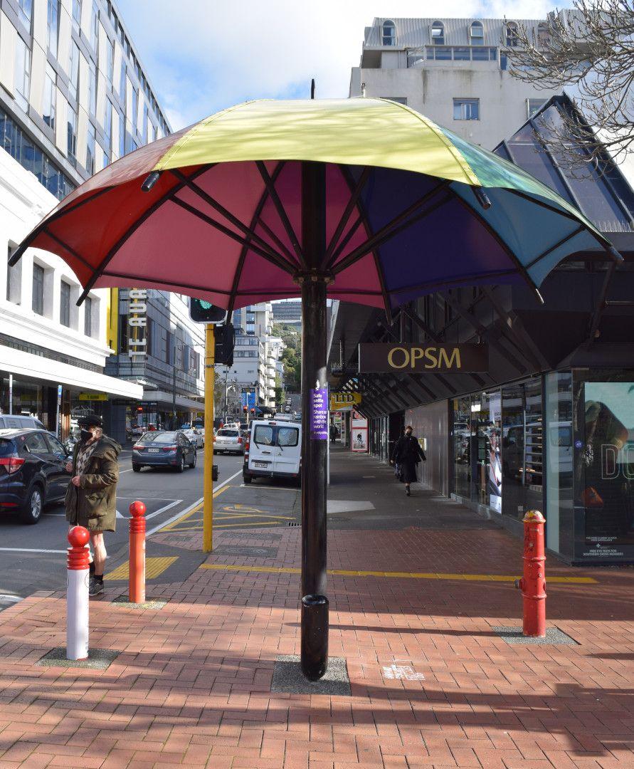 Peter Kundycki, ‘Umbrella’ (1990), Cnr Cuba & Dixon Sts, Te Aro, Te Whanganui-a-Tara Wellington