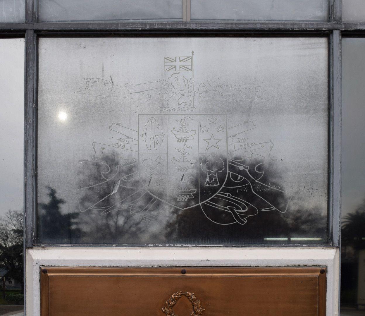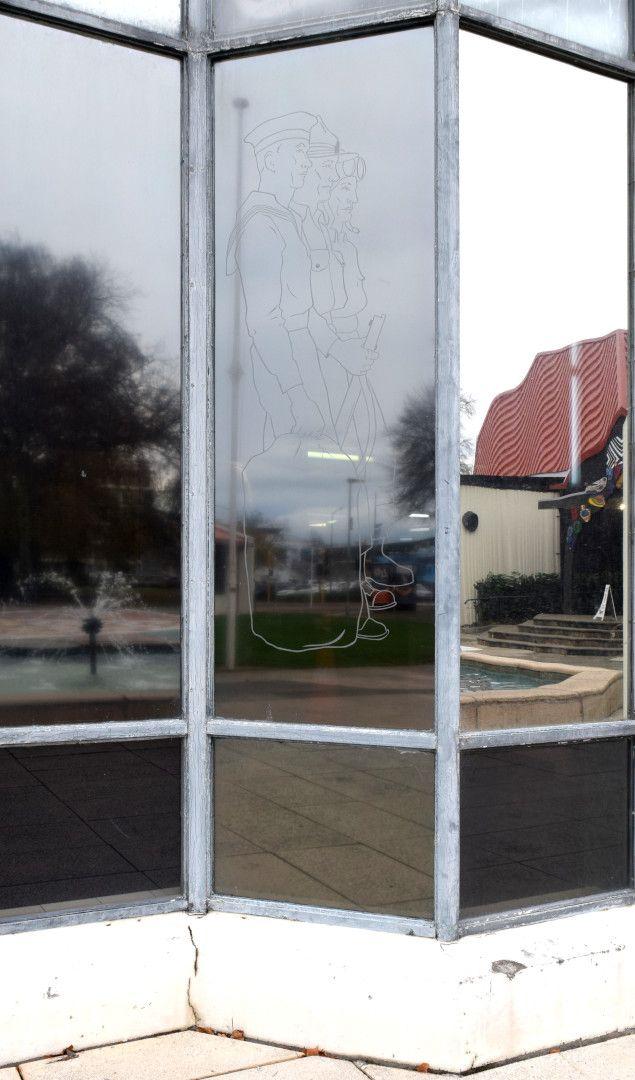 This mural depicts an assault by the joint branches of the armed forces on an unspecified beach. Peter McIntyre also design three windows, and two bas-reliefs on the exterior of the library building.