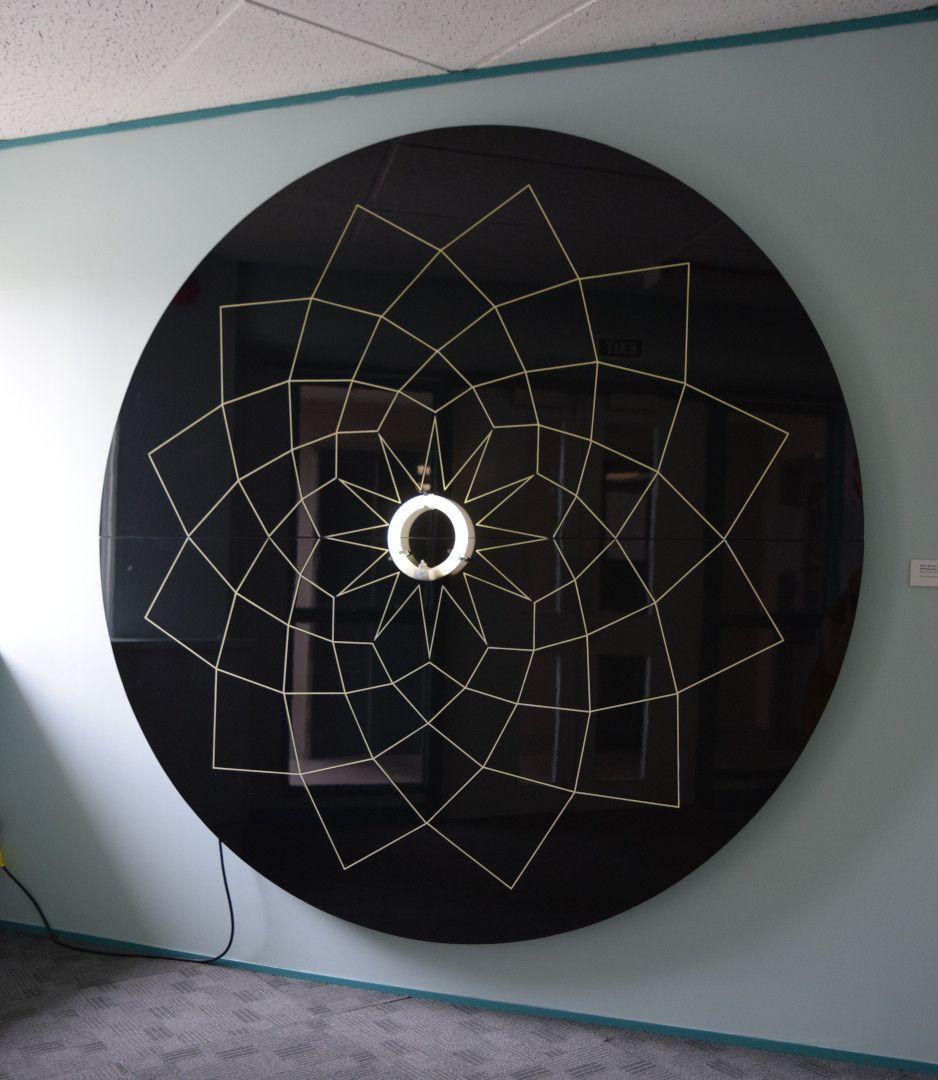 A circular, wall mounted sculpture in mixed media (lacquered board and neon ring light).
