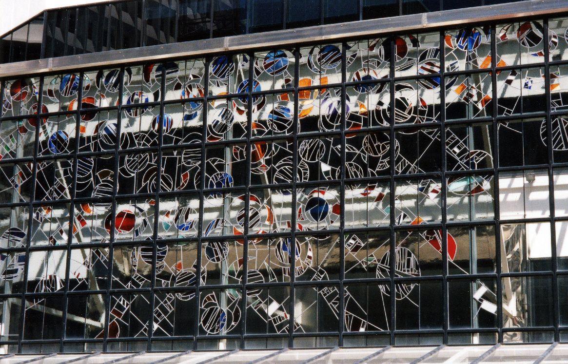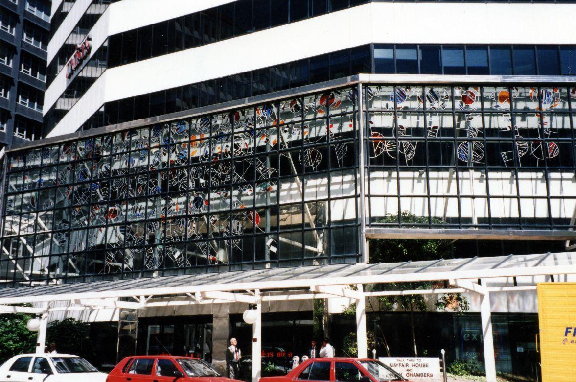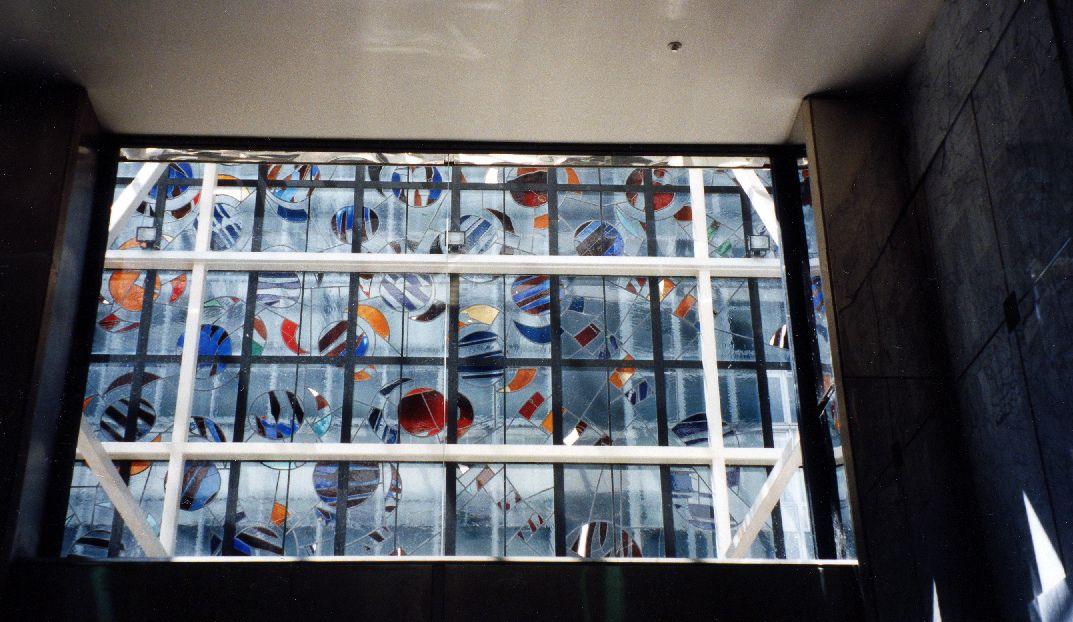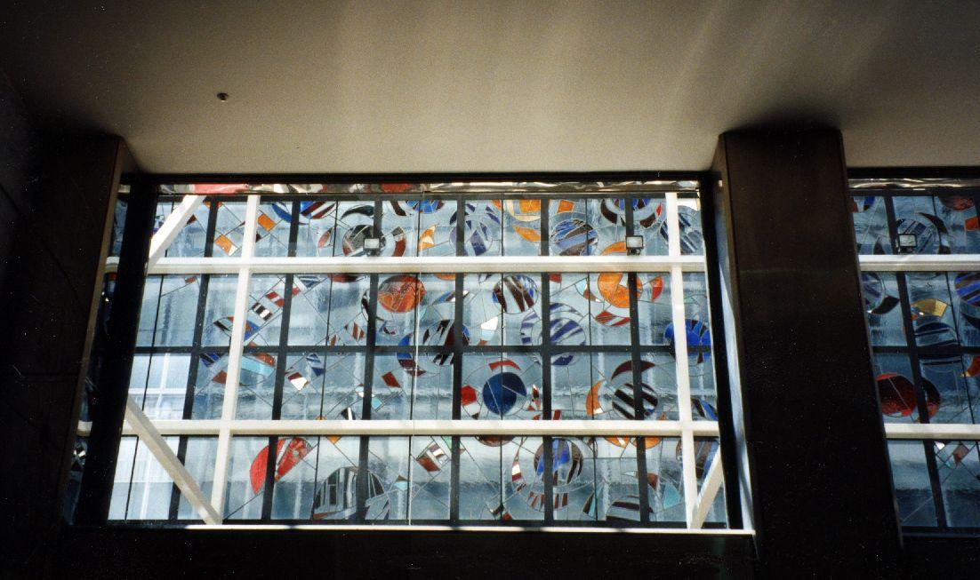 Northern Lights was commissioned by the Kiwi Property Group for Unisys House at 44-52 The Terrace in 1986 and funded through the Wellington City Council’s Arts Bonus Scheme. Designed by Philip Trusttrum and made by Suzanne Johnson and Ben Hanly, the work comprises multiple panels of coloured and leadlight glass that formed a canopy for the building.