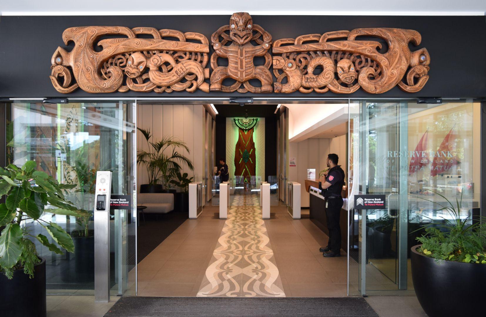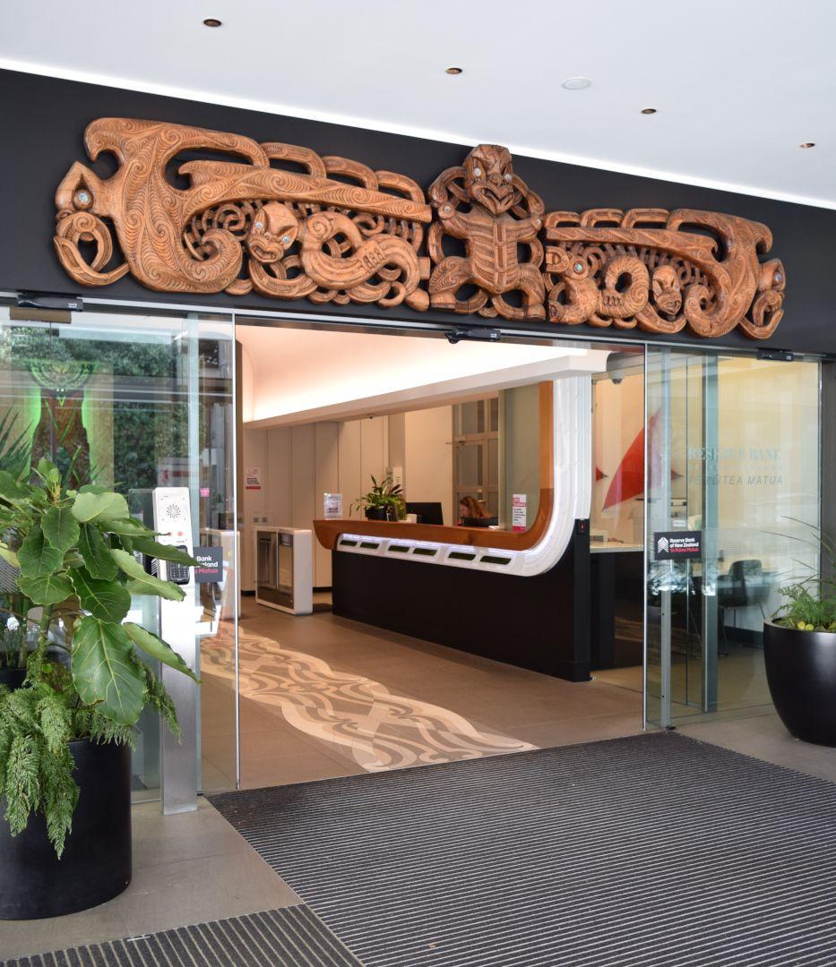 “The carving in the entrance foyer of the Reserve Bank of New Zealand is named ‘Punatoto: The Life Force’. Punatoto was an ancestor of Te Atiawa who lived in Whanganui-A-Tara, the Maori name for Wellington harbour. Pita Rua Lagan, a Tuhoe carver from Matahi in the Urewera, currently living in Picton, was commissioned by the Bank to carve Punatoto as part of New Zealand’s commemoration of 150 years since the signing of the Treaty of Waitangi.