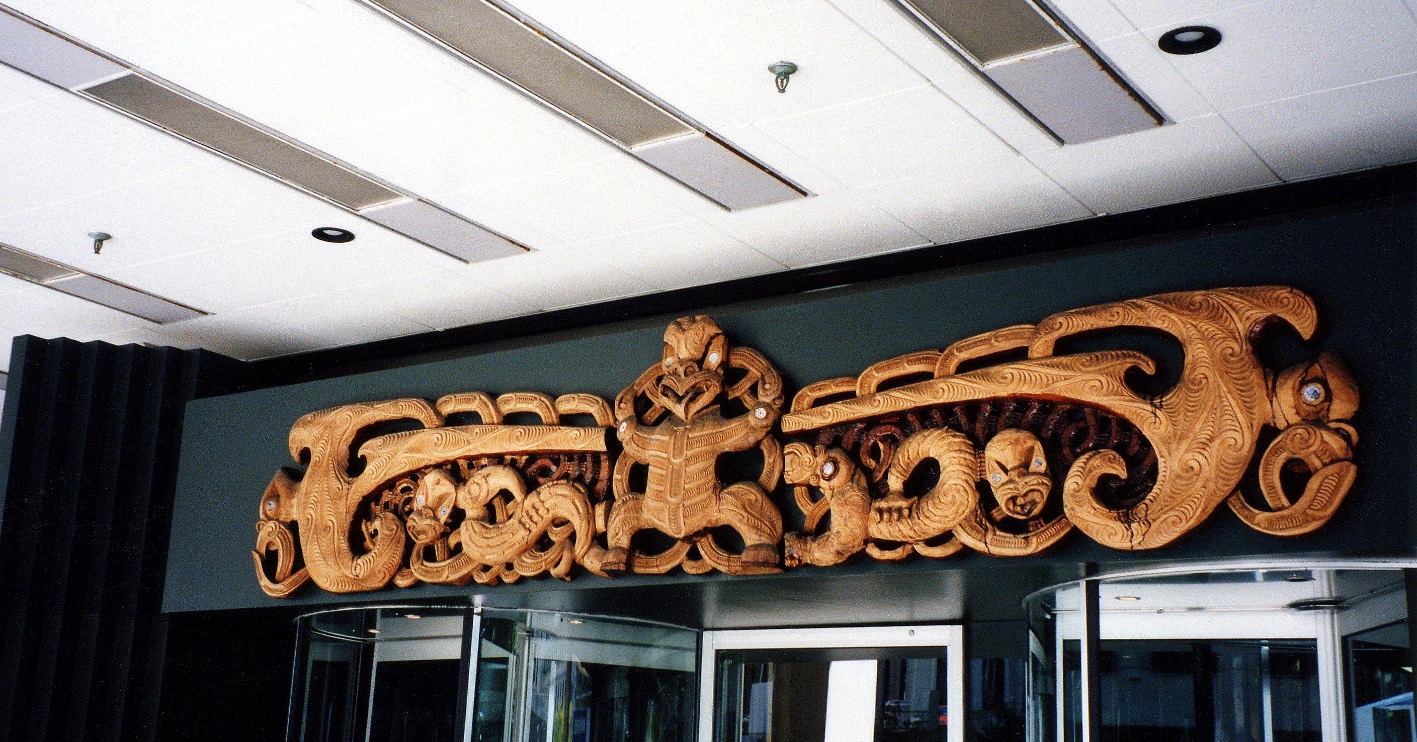 “The central figure is Maui, a mythological hero who, according to Maori legend, fished up the North Island. Wellington is recognised by Maori as the ‘head of the fish of Maui’. The figure of Maui also represents Papatuanuku, the mother of Tane, who in Maori cosmology provided totara wood for carving from the forest of Te Wao Nui A Tane. The area above the carving represents Rangi, the Sky Father.