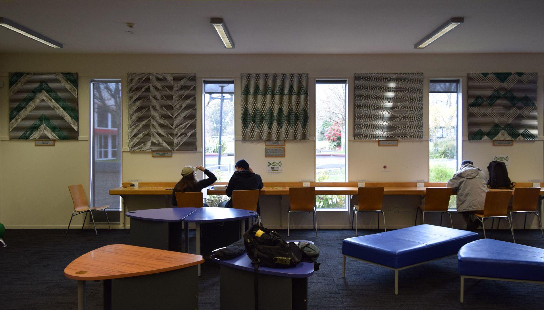 Likely to be the first of their kind in Aotearoa New Zealand, the five panels are a modern adaptation of the traditional approach to tukutuku, and assembled from industrial materials including telephone cable (plastic electrical insulation tubing) chromed pipe and held together with round headed bolts.