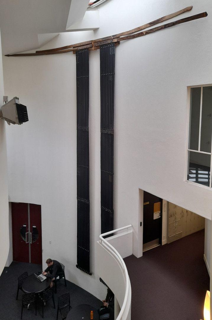 Construction in enamel painted corrugated iron. A very tall assemblage that goes the full height of the multi-story foyer. Drops of corrugated iron fall clear of the gentle curved wall behind.