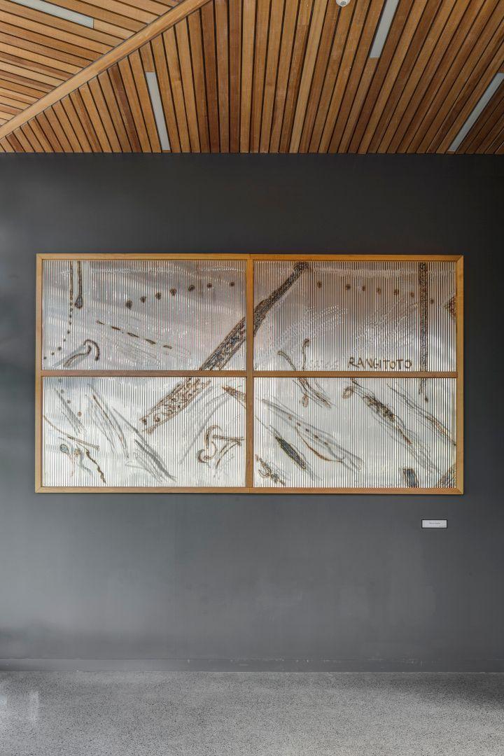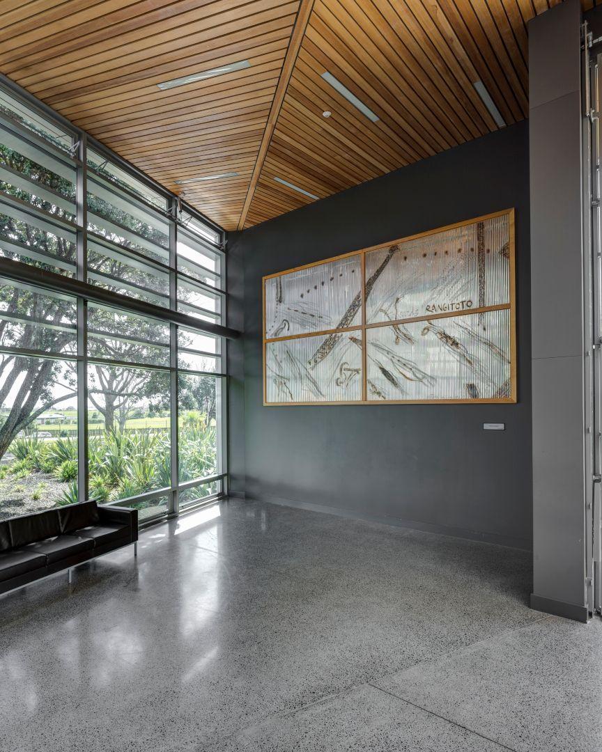 “The participation of Auckland architect Rewi Thompson was also sought, to ensure that the interiors reflected a sense of unity in diversity. He developed a consistent set of guidelines within which a selection of New Zealand artists and sculptors from all local cultures could contribute works suitable for the building. A theme of “Fire and Water” was adopted as particularly appropriate to the Auckland region, referring to its volcanic history and its water surrounded character. Thompson was responsible for the tiled floor in the entrance lobby which depicts a mat incorporating images of mountains, headlands and volcanoes of the region.”