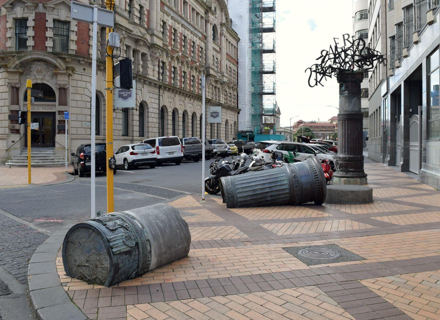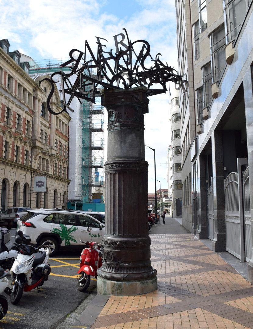 Rūaumoko is the god of earthquakes and volcanoes. This sculpture's broken columns and confusion of bronze letters look like the result of an earthquake. However the components actually came from the demolition of the nearby State Fire Insurance Building, in the early 1980's, including sections of marble faced decorative carving.