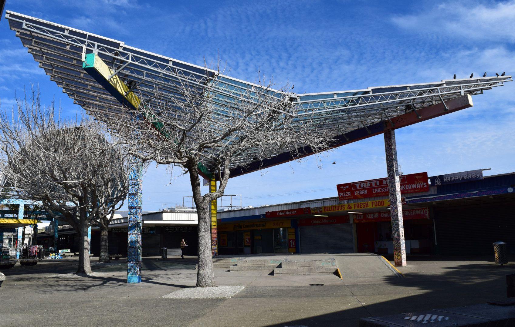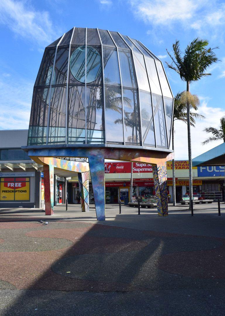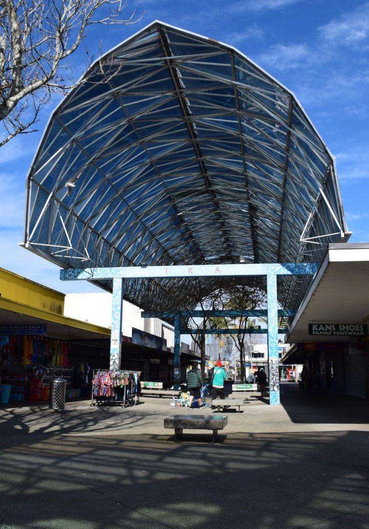 “Commissioned by Manukau City Council to revitalise this vandal-prone 1960s shopping mall, Thompson was asked to create an identity for the place that more closely reflected the predominantly Māori and Polynesian character of the area. The image of a fish was selected for the project, which Thompson realised as a series of canopies. The strongly Pacific–inflected decoration of the structures was controlled by the local community and carried out by local artists – the lower level concrete elements were painted and lashed with ropes.” (Barrie)
