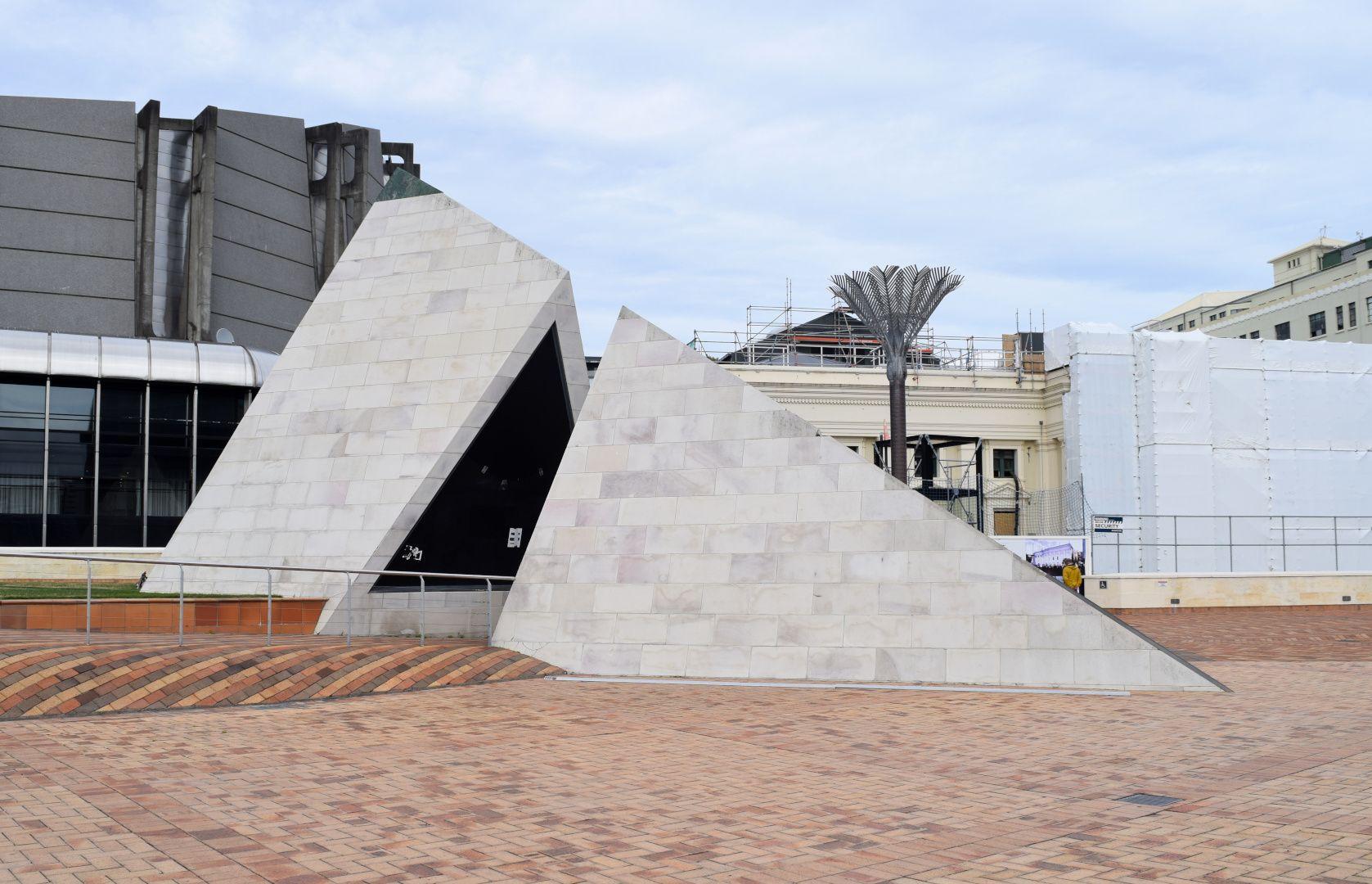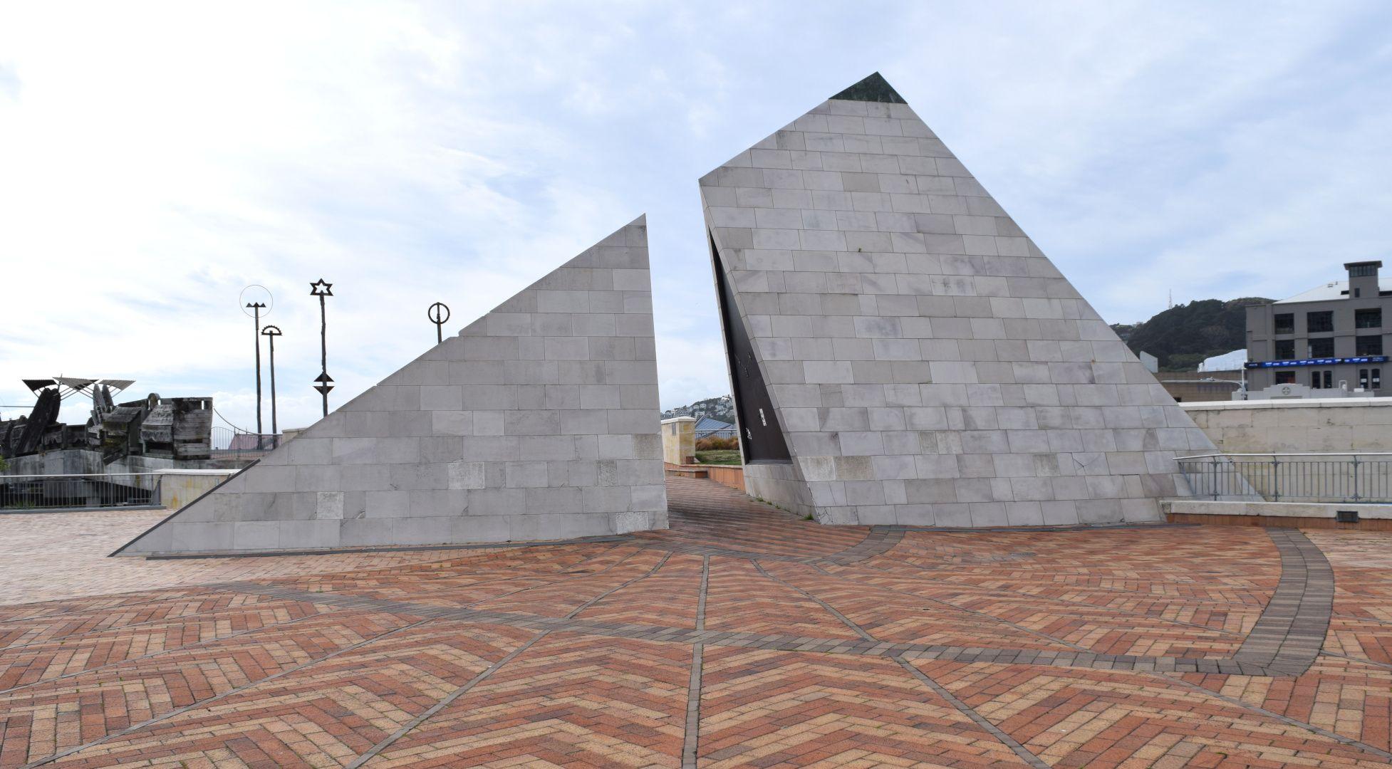 Te Aho a Māui comprises a split-form pyramid topped with pounamu/greenstone sourced from the South Island Te Waipounamu. The pyramid represents a mountain meeting the sea–a symbol for Te Waipounamu, the South Island–while the paving represents Māui’s fishing net, in a nod to the well-known Māori legend of Te Ika-a-Māui.
