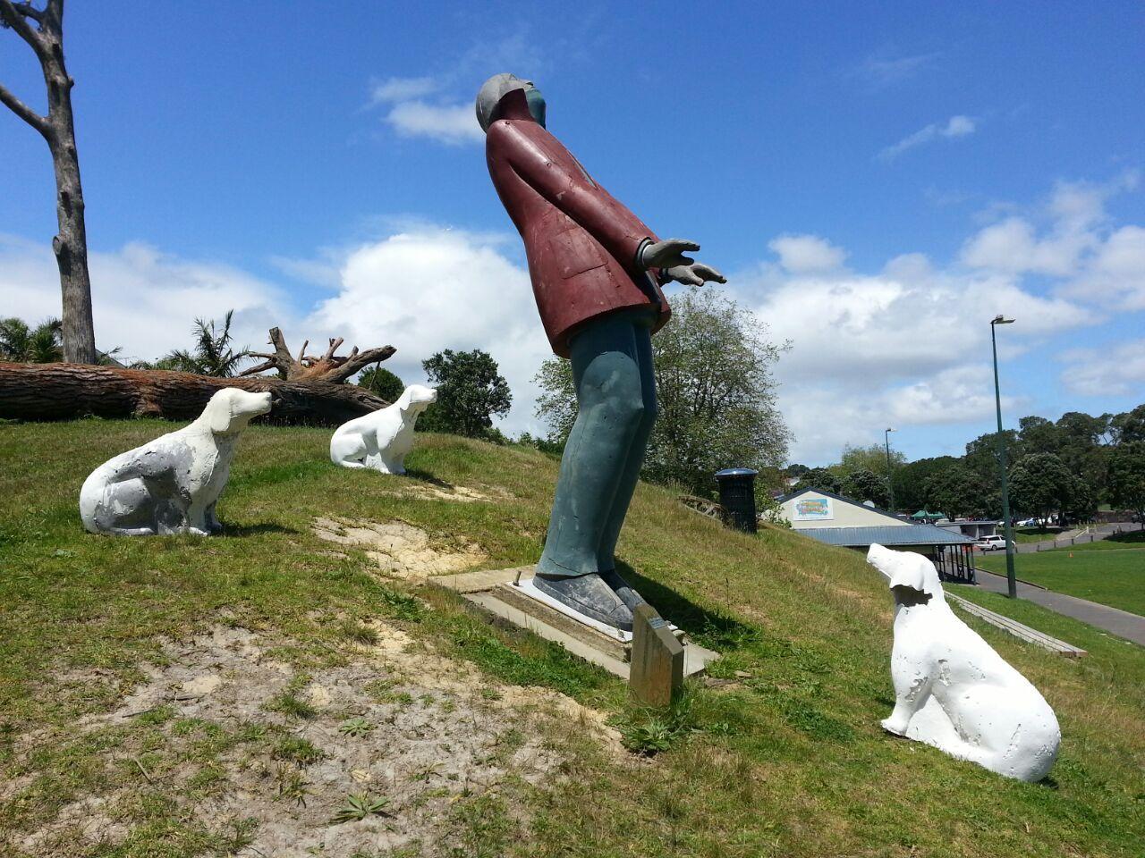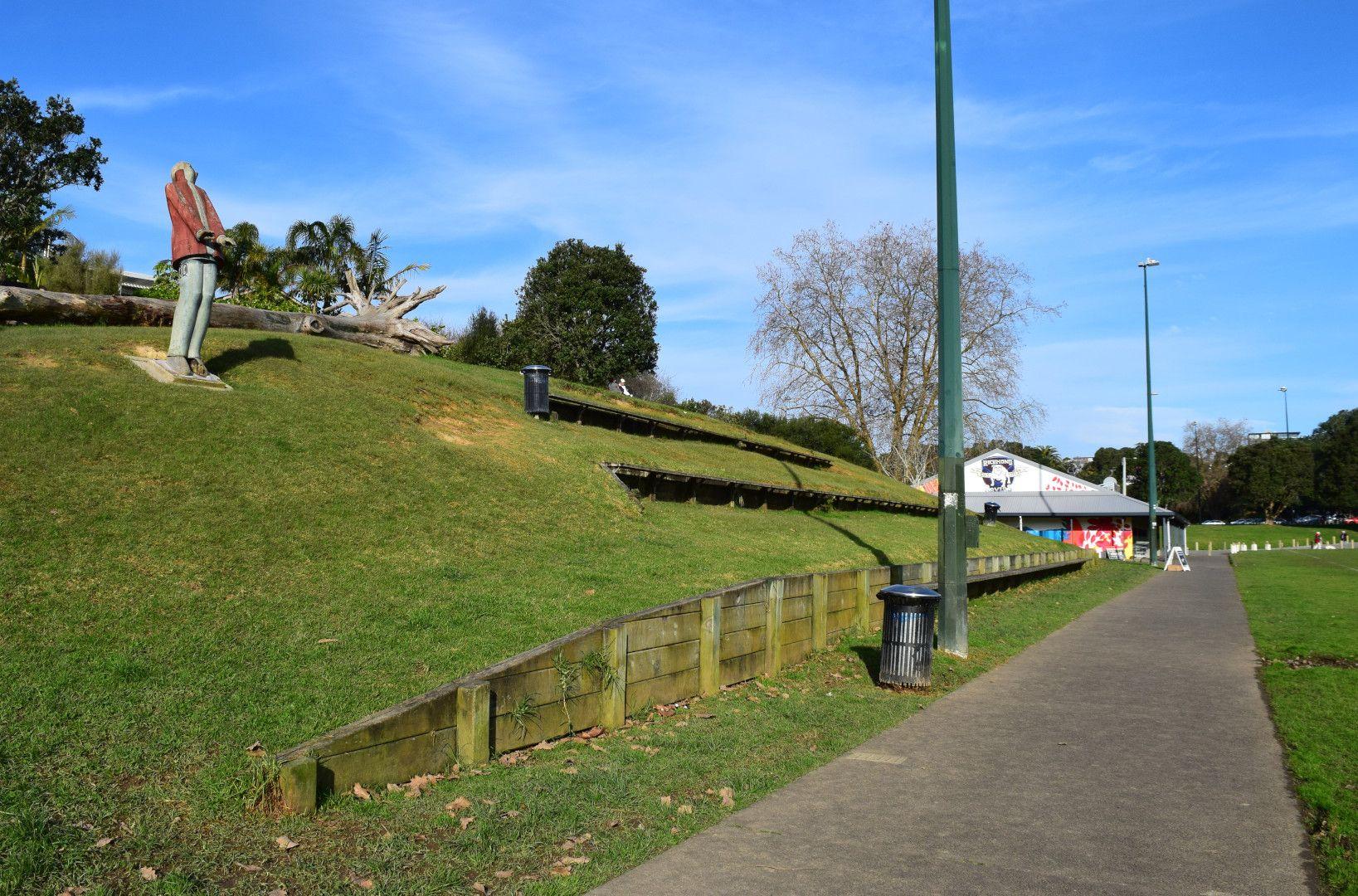 A large-scale human figure leaning back into slope, hewn from macrocarpa. The artist has described the figure as a portrait of a friend who was seen warming his hands over a barbecue.