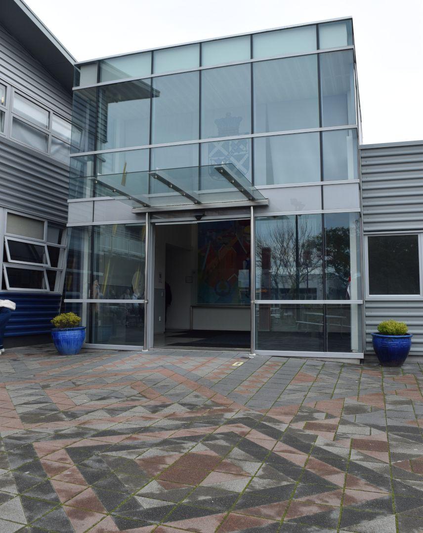 The eye is carried along the Parade to the Havelock Hills and the Kidnappers, the view we see from the school, and symbolically the wide outlook that education brings.