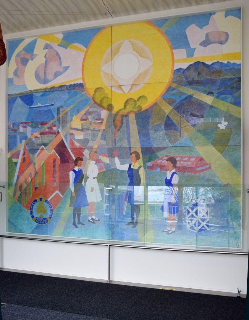 The Mural is the artist's interpretation of Napier and of the two schools which merged in 1931 - the Napier Girls' High School and the Napier Technical College.