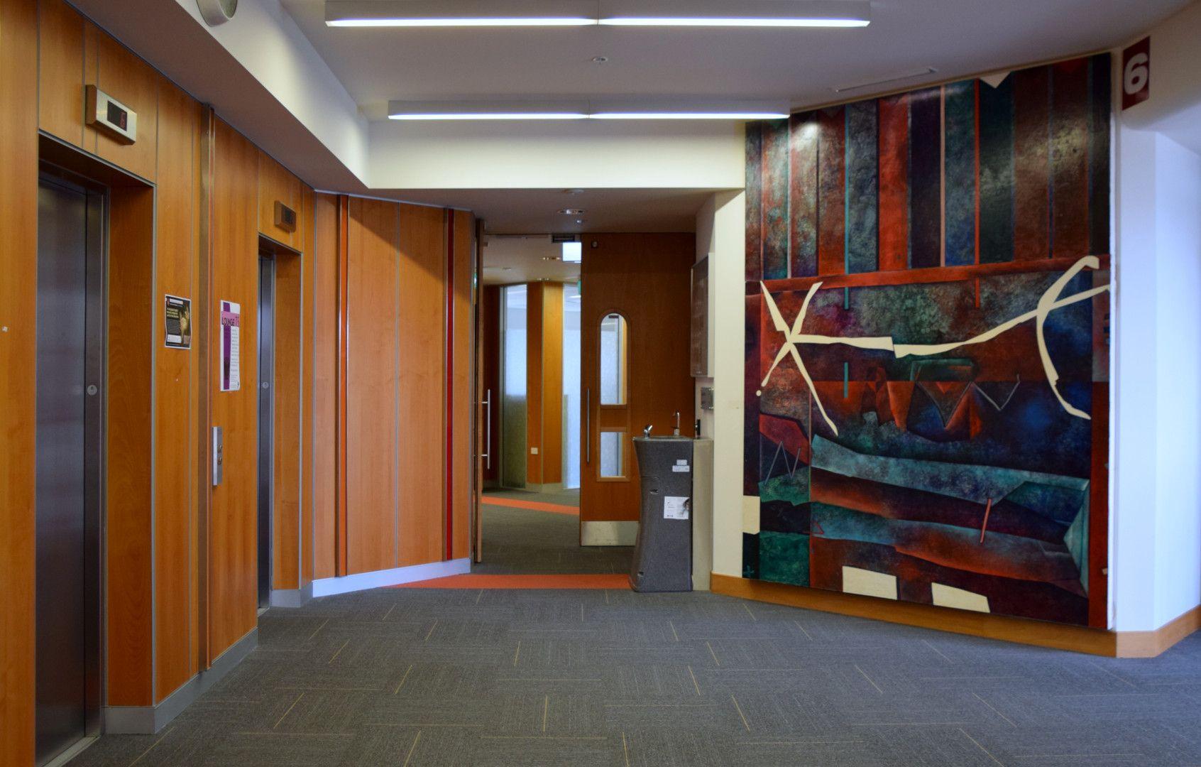 It work is one of a number of works commissioned by Pat Hanly for each of the level foyers when Building 206 (originally Arts 1 Building) was built in 1984.