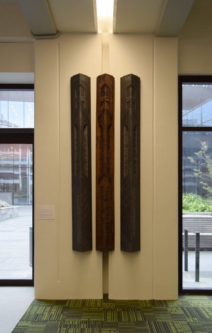 3 mounted, carved triangular pou. Of the three stylised poupou figures carved out of wood and lead that make up Nga Tauira Tuatora, Jahnke writes: