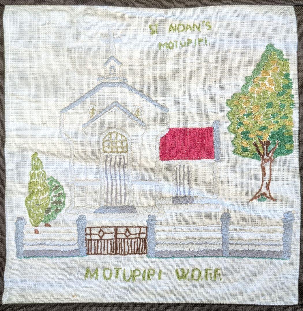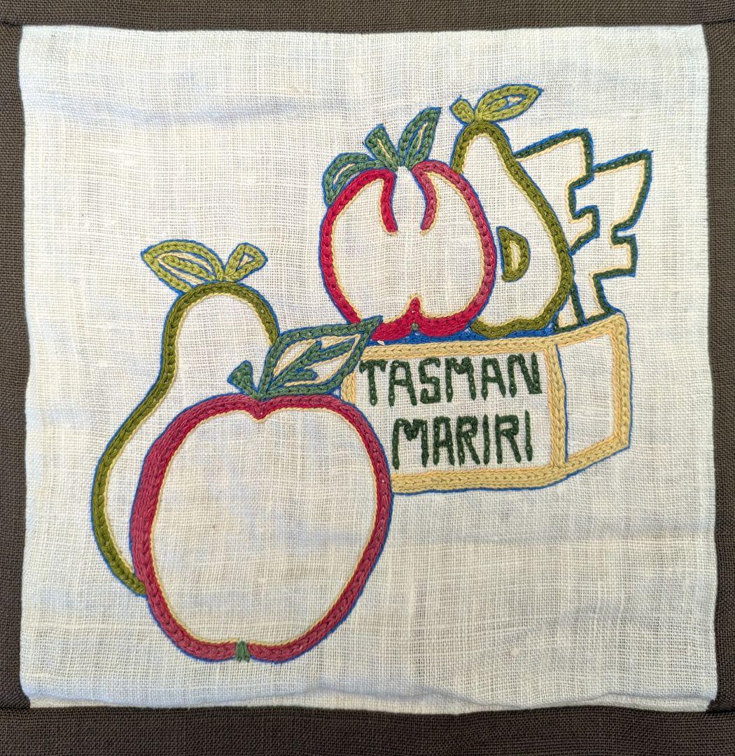 This quilt was made by branches of the Women’s Division of Federated Farmers in the Tasman District in conjunction with the Tasman District Council. It commemorates 150 years of European settlement in the Nelson Province and the 350th Anniversary of Abel Tasman’s anchorage in 1992. Each branch has depicted something of significance to its area.