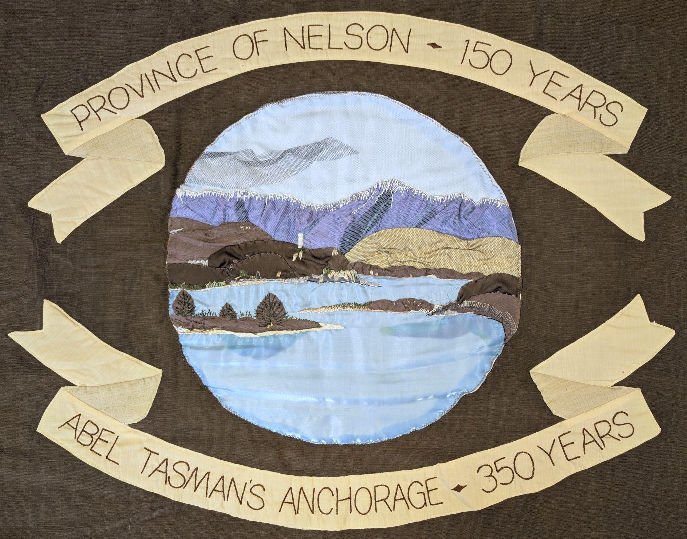 Women’s Division of Federated Farmers (now Rural Women New Zealand), ‘Province of Nelson - 150 years commemorative quilt’ (1992), Richmond Library, Waimea Richmond, Te tai o Aorere Tasman District