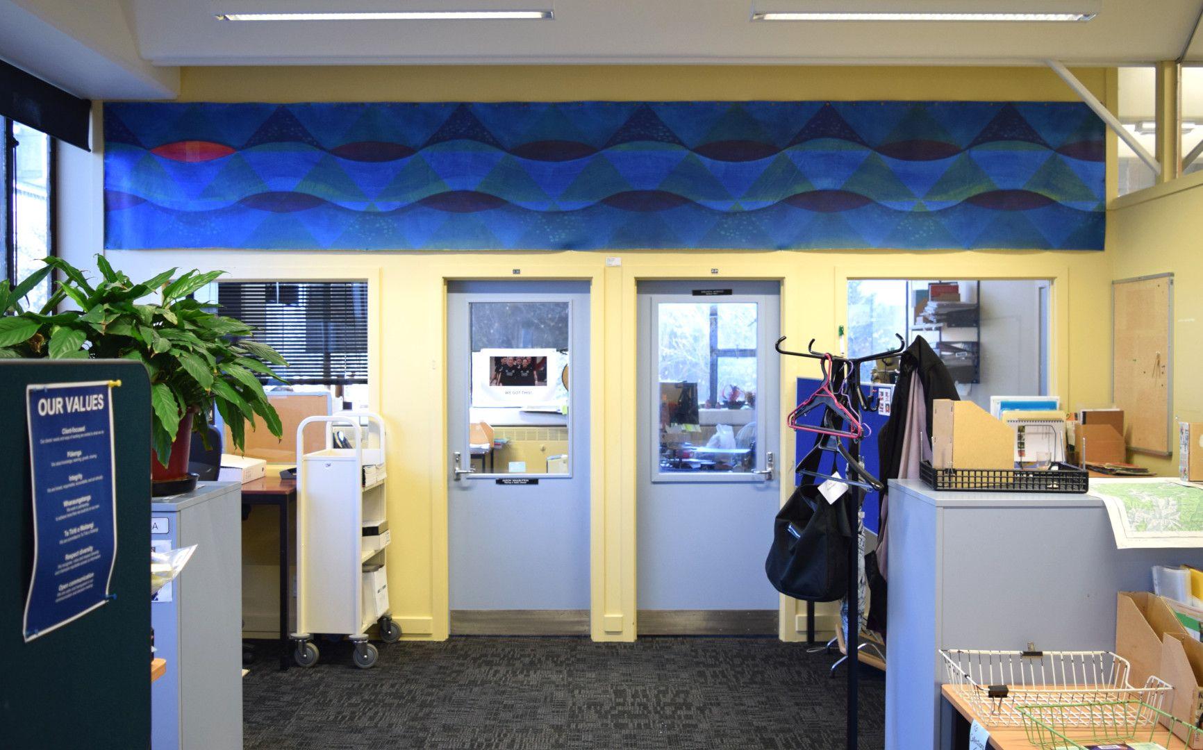 Painting is installed as a frieze. Composed in sea/water like colours, a rippled band travels across a pattern of upward pointing triangles in green. One upwelling of the ripple on the left is picked out in red/orange.