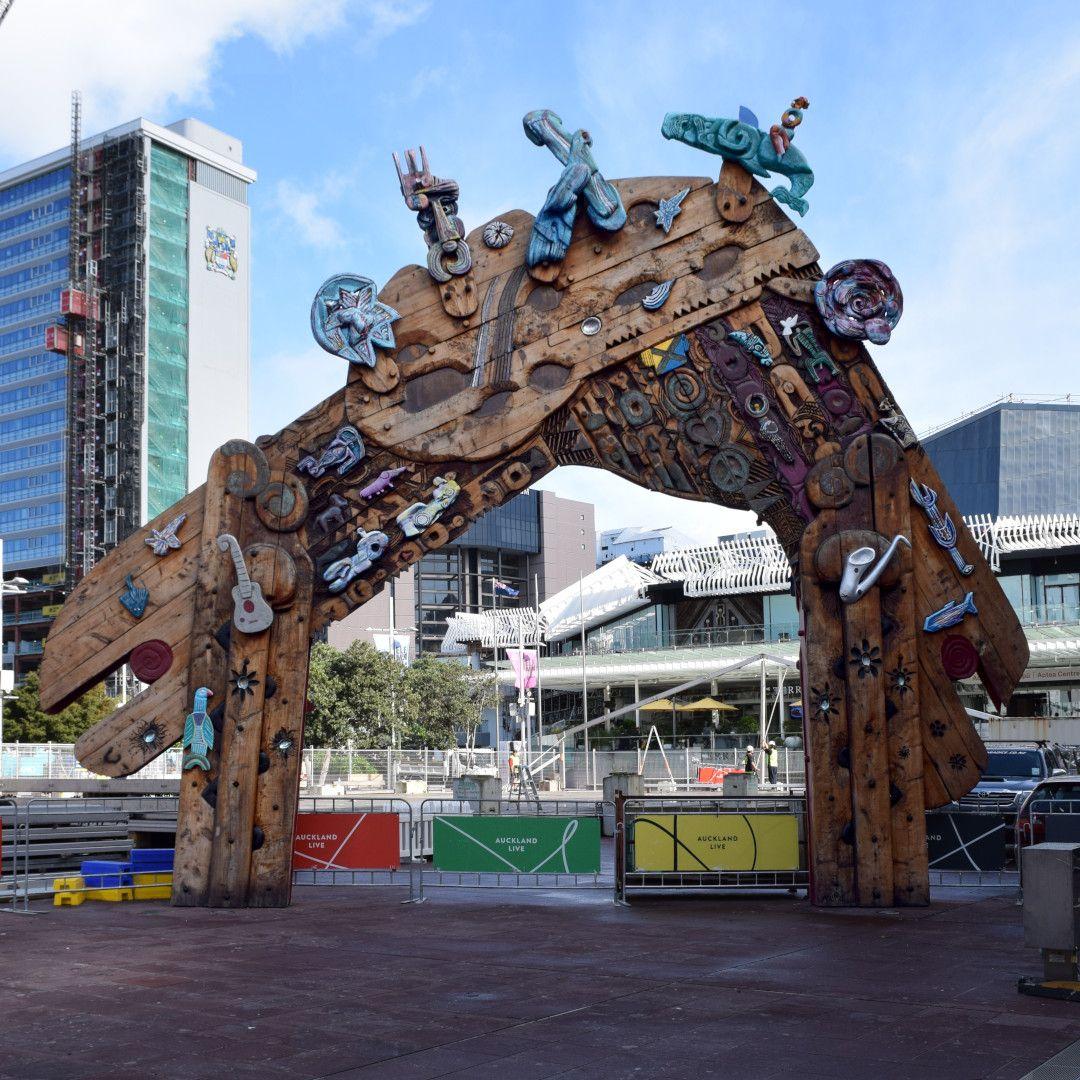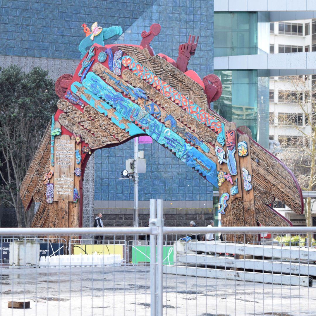 Update, May 2024: Auckland Council are currently assessing the condition of Selwyn Muru’s Waharoa. It is more than 30 years old. If you are visiting Aotea Square, you will notice the five carvings at the top of the arch have been removed. These are being examined and may need some restoration work. They will be back in place in August 2024.