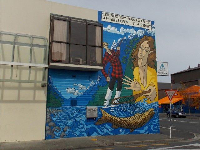 “Modigliani’s Trout is in the style of famous Italian artist Modigliani, known for his use of mask-like faces and elongated forms. It was commissioned by the Youth Hostel Association for their building and features a humorous take on an iconic New Zealand outdoors scene.”