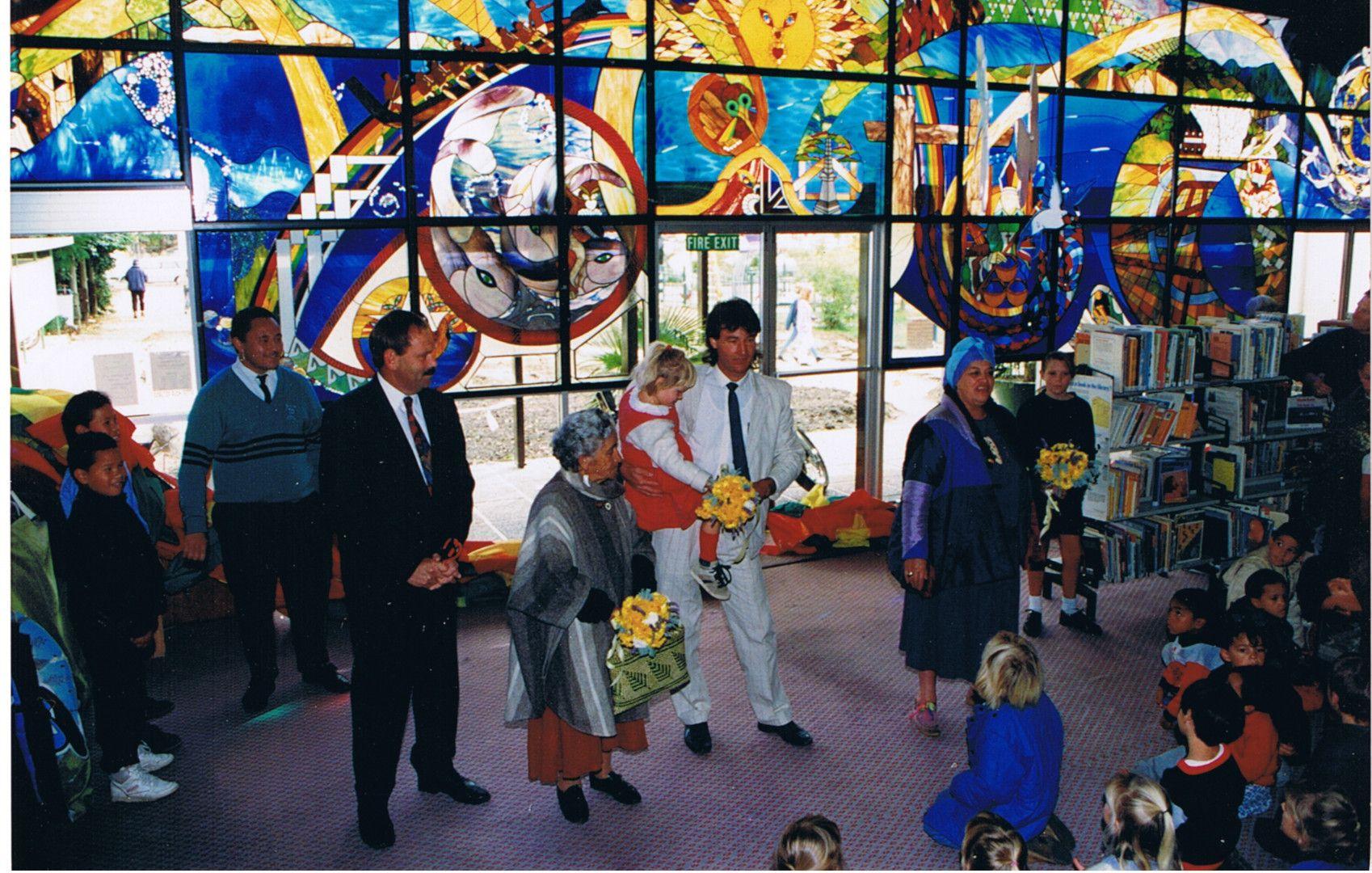 At its unveiling on 1st May 1993 karakia was conducted by Dr. Rangimārie Te Turuki Arikirangi Rose Pere CBE and the work was unveiled by 'Auntie' Ada Haig and Mayor John Clarke.