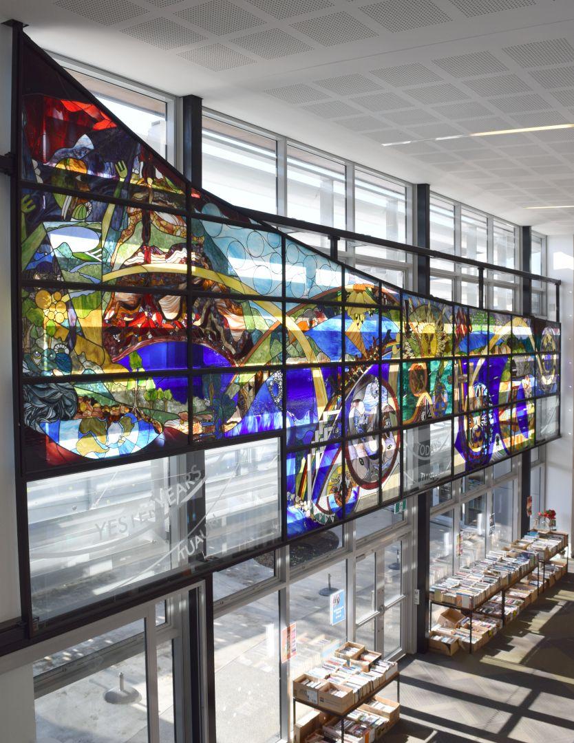 The window was carefully deconstructed, stored for over a year, and reinstalled on a north-facing window during the 2018 upgrade of the library building.
