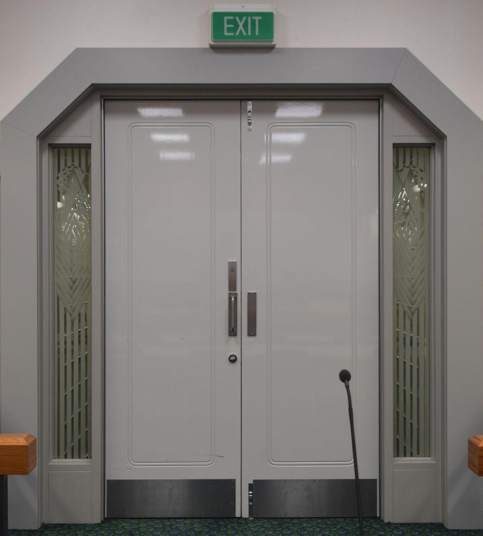 Stephen Pene, ‘Sandblasted Panels’, Entrances to Courtrooms 5 & 7 [showing exit], High Court, Te Whanganui-a-Tara Wellington. Images: Bronwyn Holloway-Smith, Public Art Heritage Aotearoa New Zealand, 2024