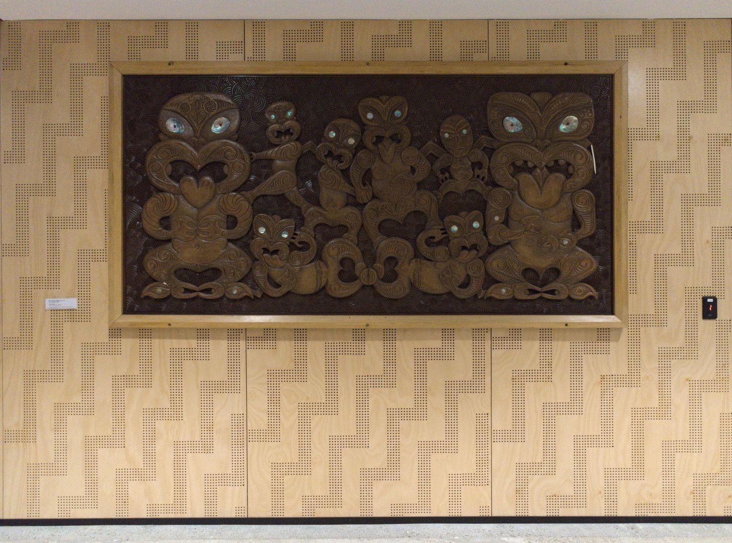 Whakairo panel of eight figures with Paua shell eyes. Two larger figures flank six smaller figures arranged in the centre of the composition.