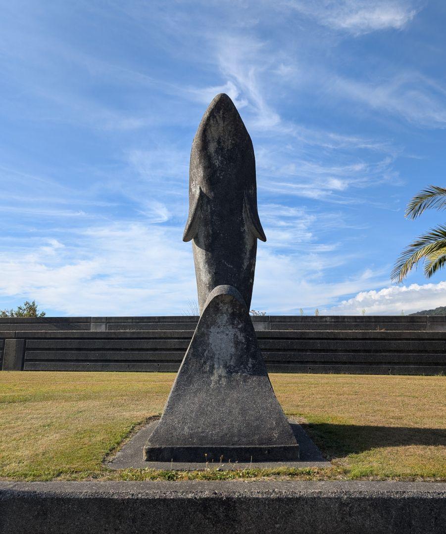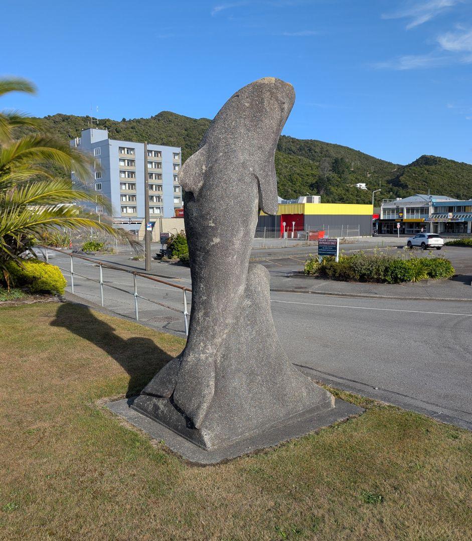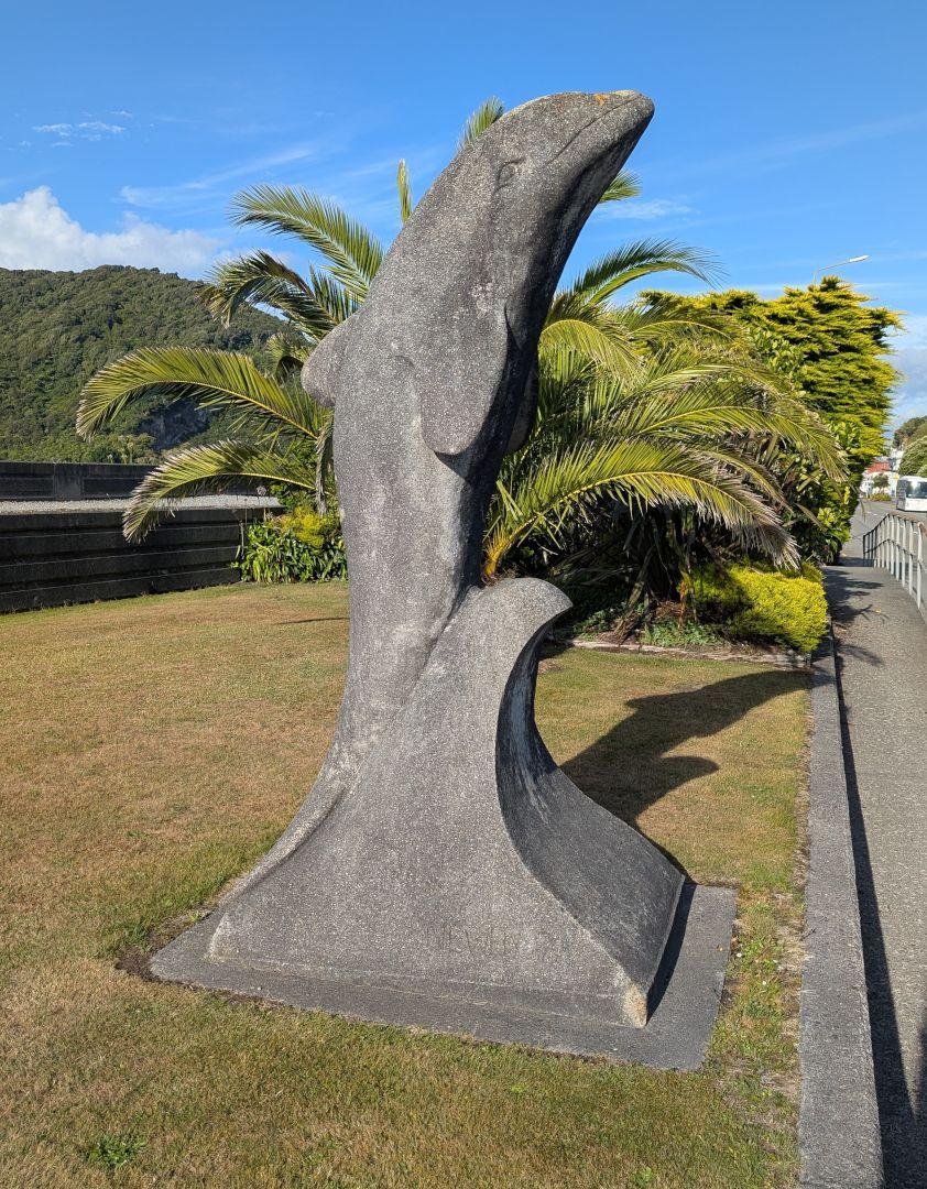 A concrete sculpture of a leaping Hector’s dolphin located alongside the Māwheranui / Grey River, near the Port.