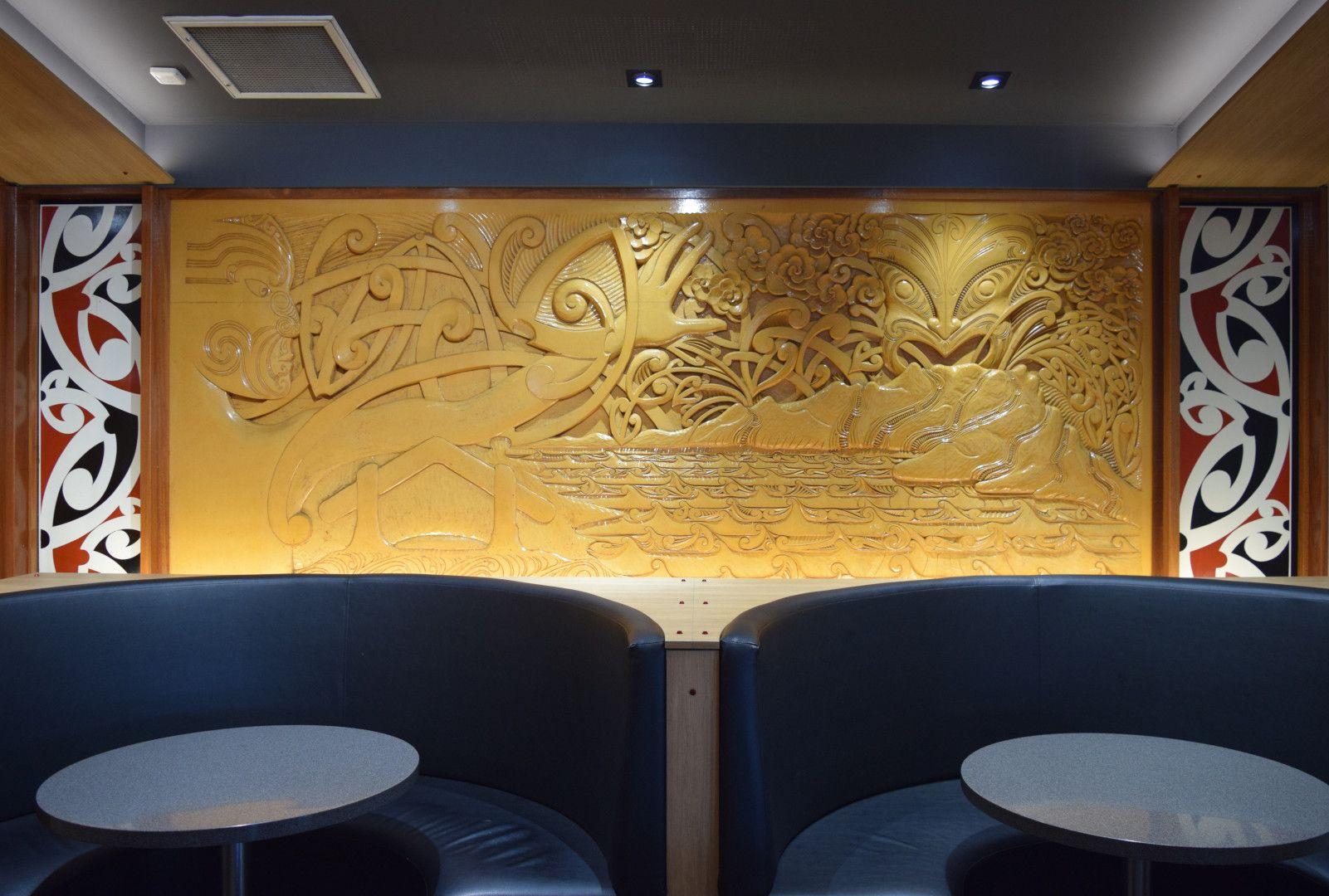 Two kōwhaiwhai panels, located either side of Tarawera mural.